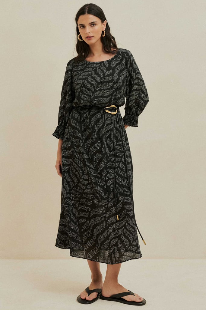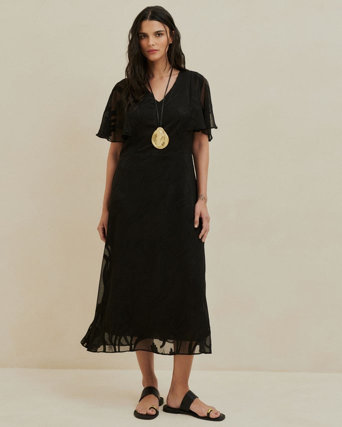 Vestido Midi Estampado em Chiffon Maquinetado Preto
