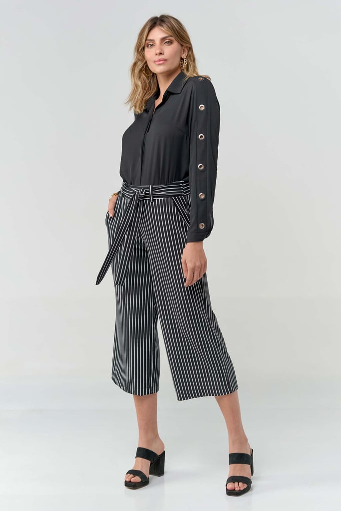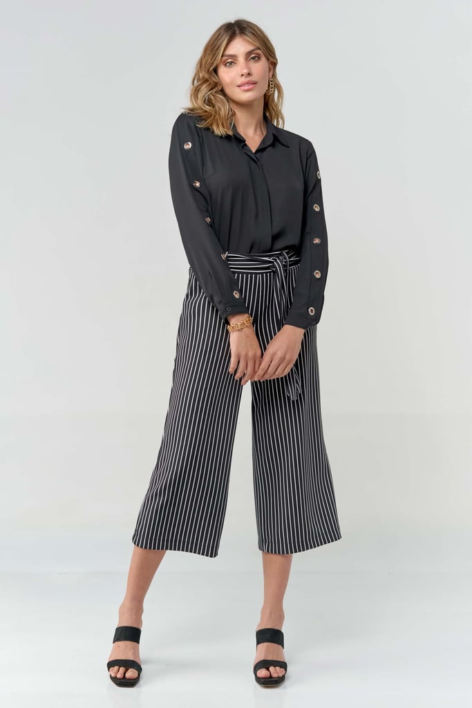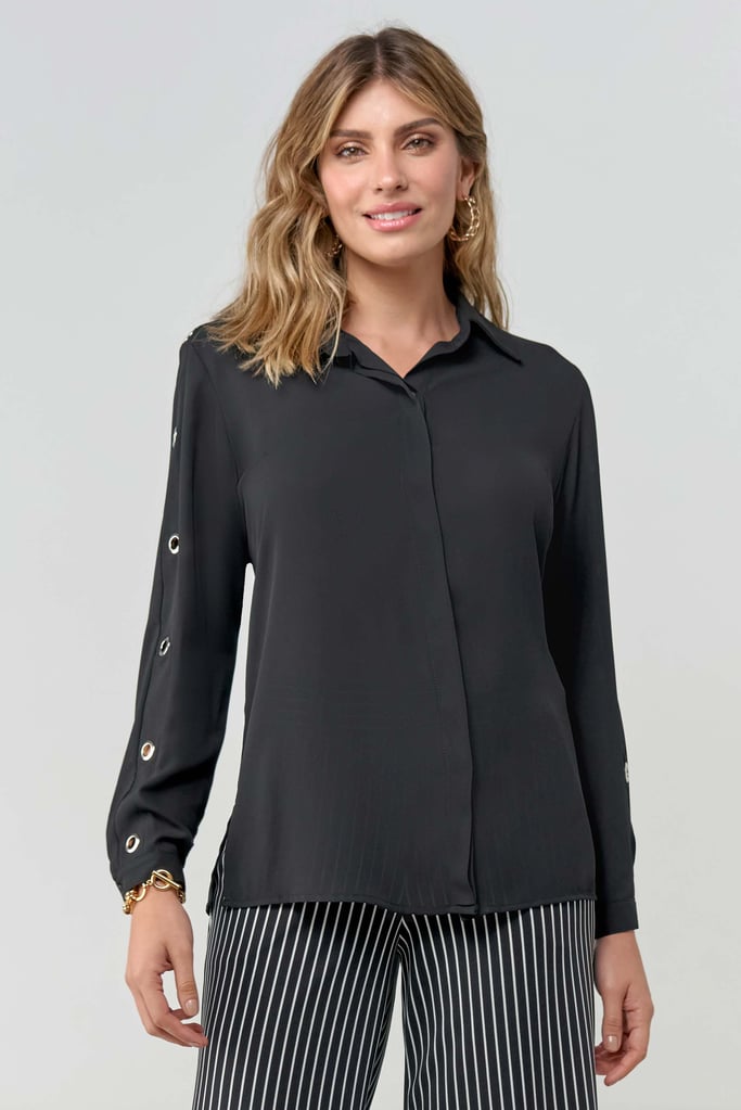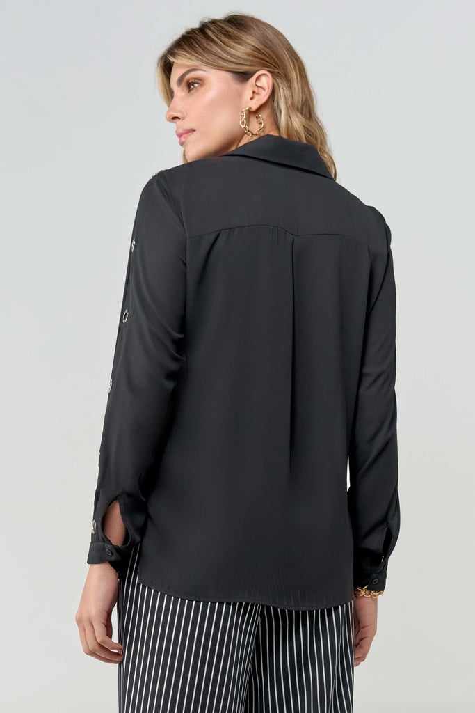 Camisa lisa, gola de camisa, fechamento frontal por botão e detalhe de pala com ilhós aplicado por toda manga