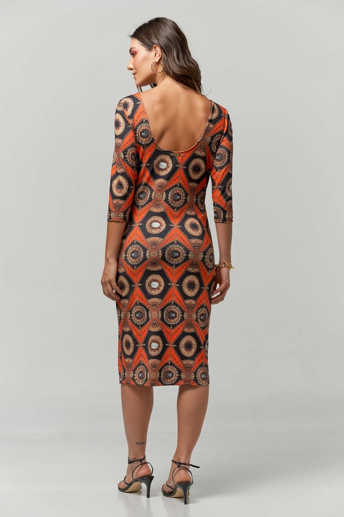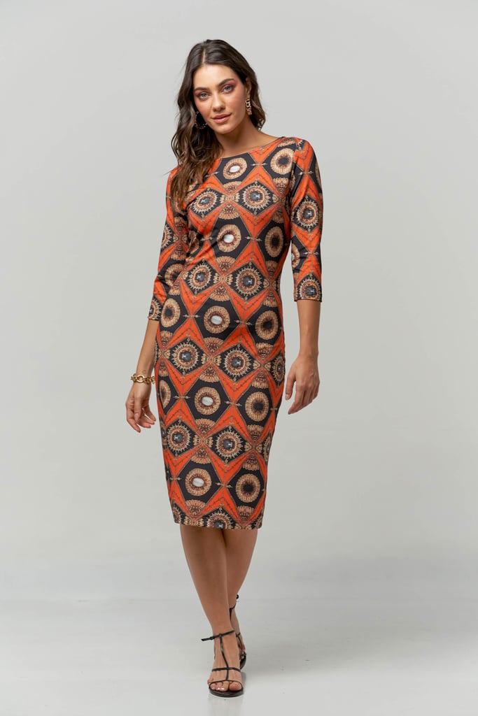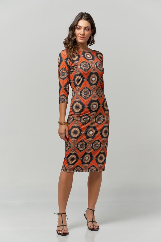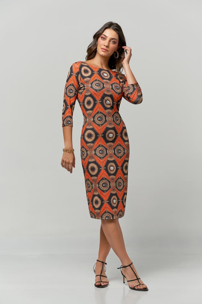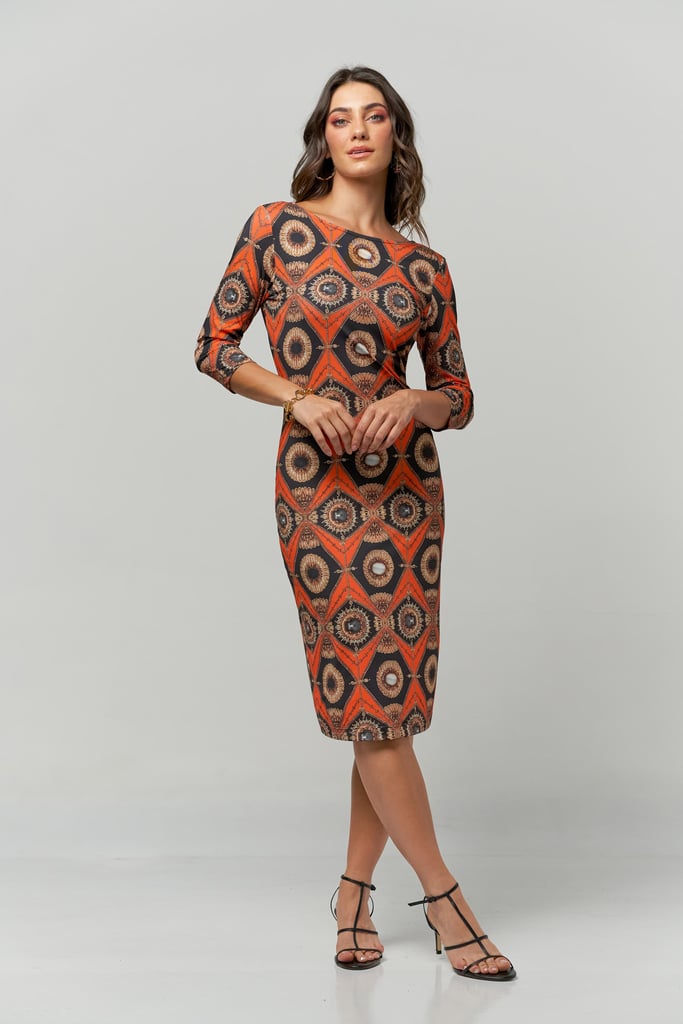 Vestido de malha estampado forrado, comprimento midi, costas em decote U e manga 3/4.