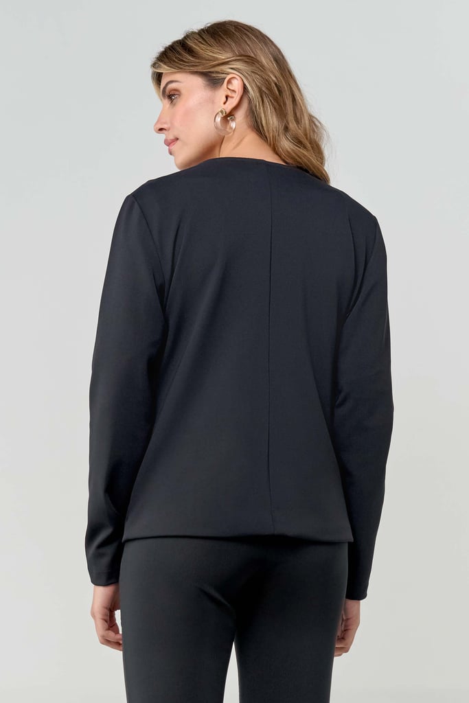 Casaco de malha encorpada, decote redondo, manga comprida, detalhe de bordado e não possui fechamento. Peça forrada