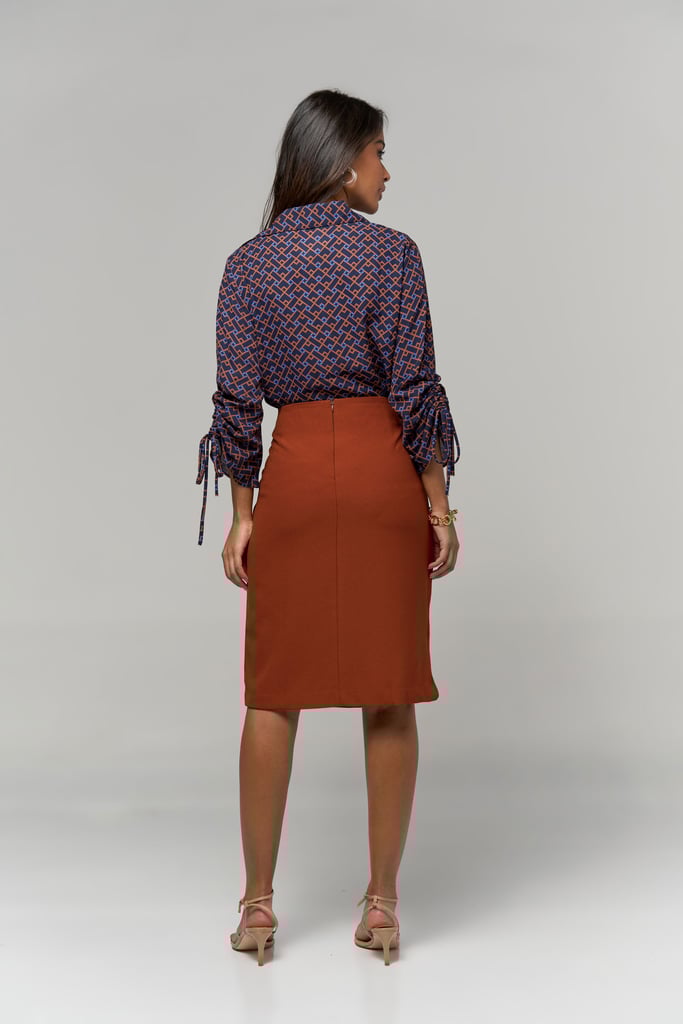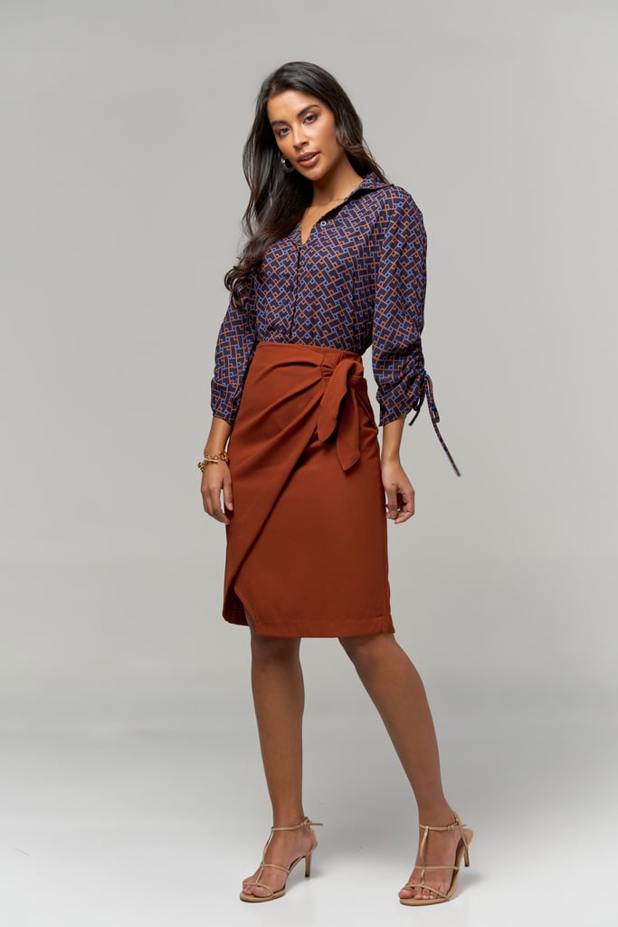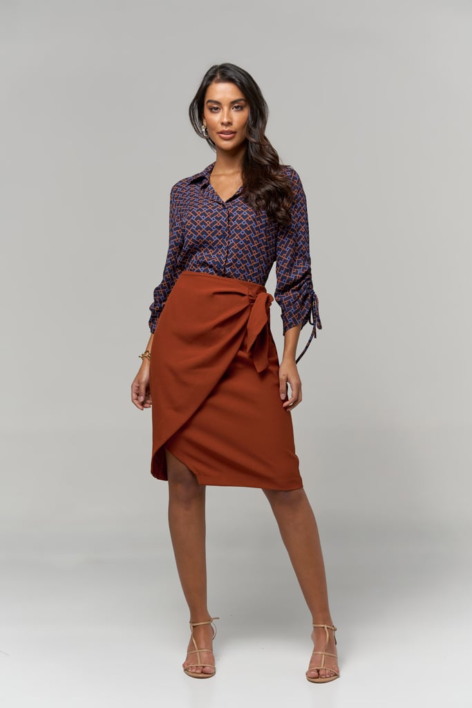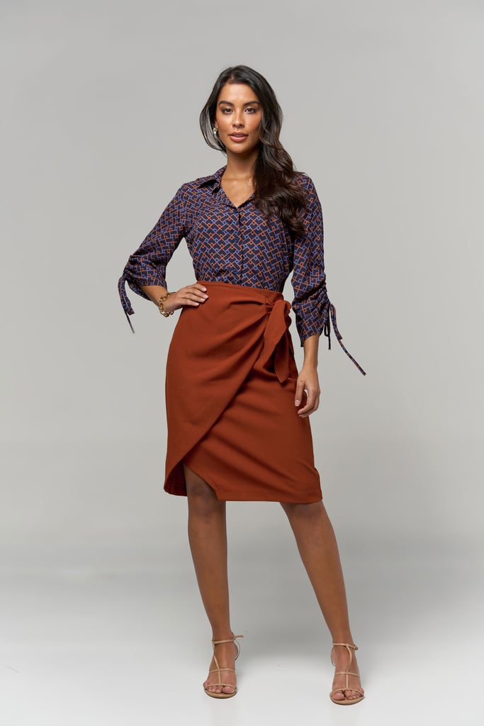 Saia de crepe transpassada com amarração lateral e fechamento por zíper nas costas.