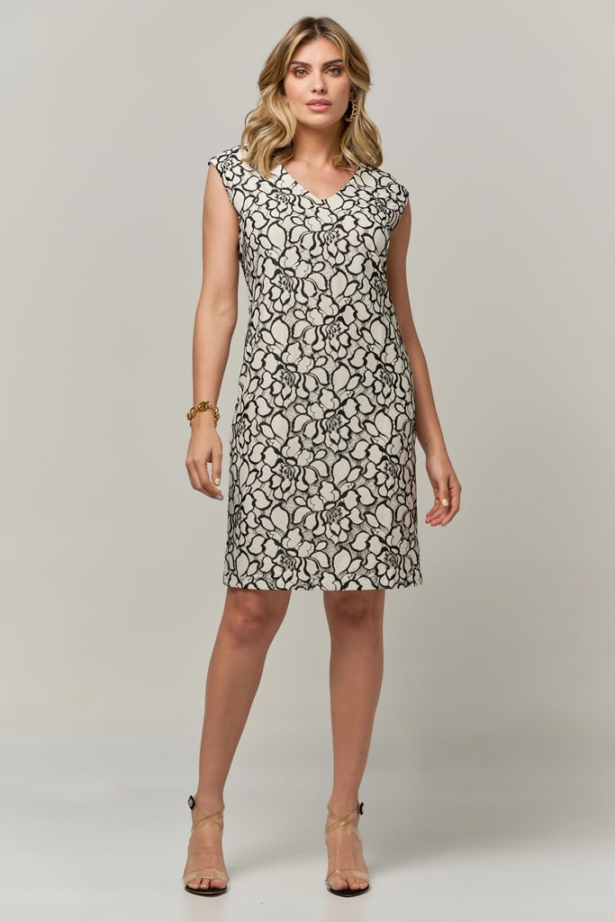 Vestido de renda forrado sem manga, decote V e comprimento midi.