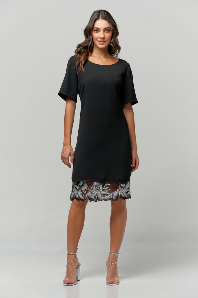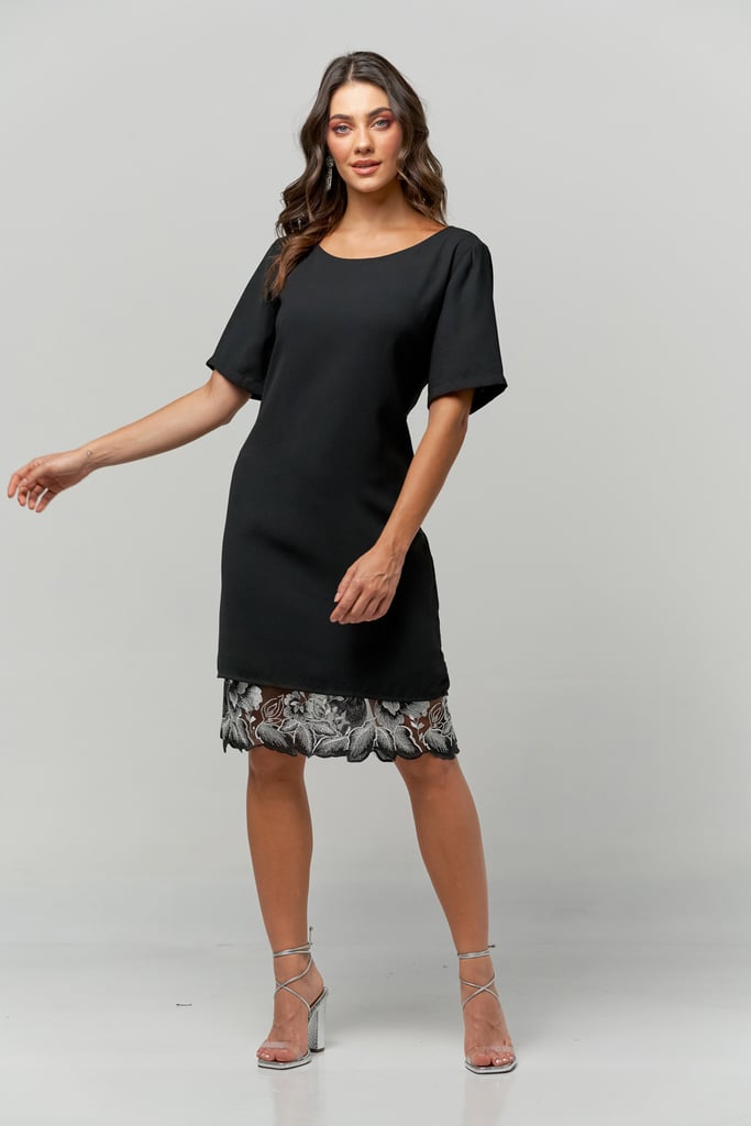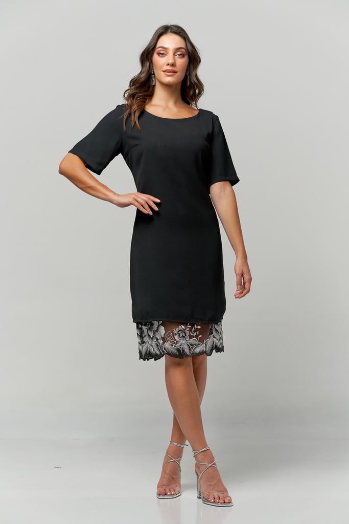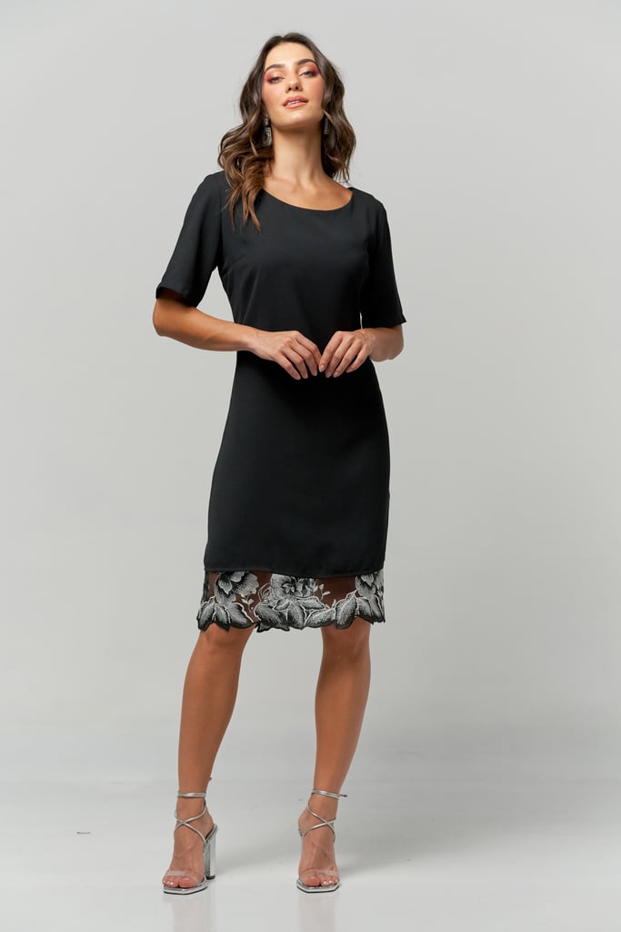 Vestido tubo de crepe forrado, decote redondo, manga curta e detalhe de renda na barra.