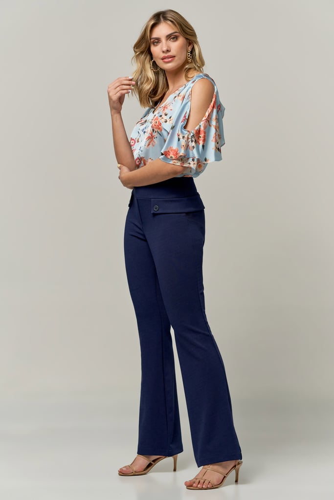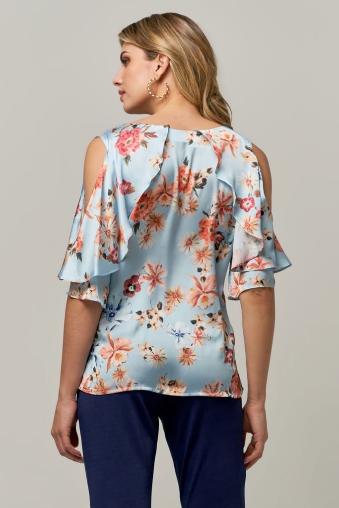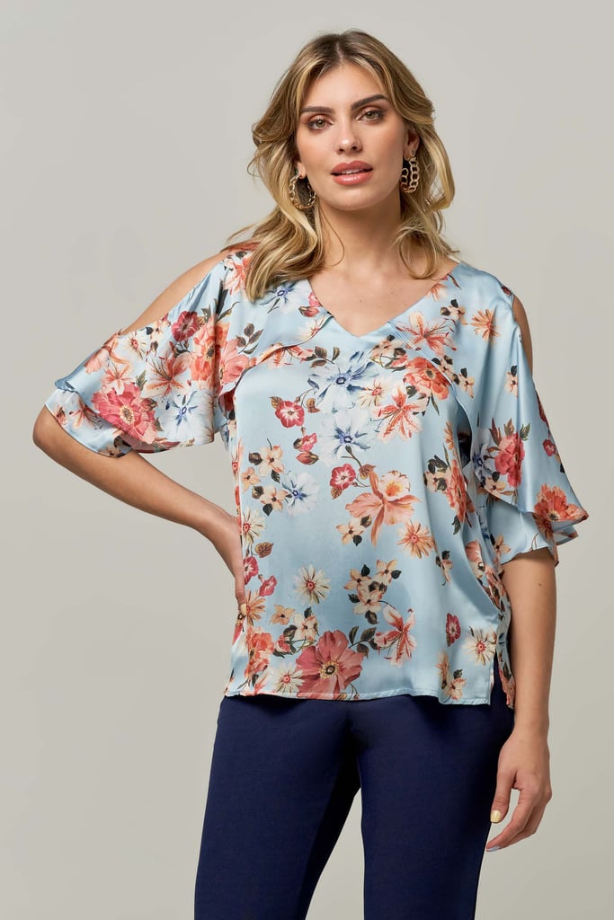 Blusa de satin estampada, decote V, manga 3/4, detalhe de babado e abertura no ombro