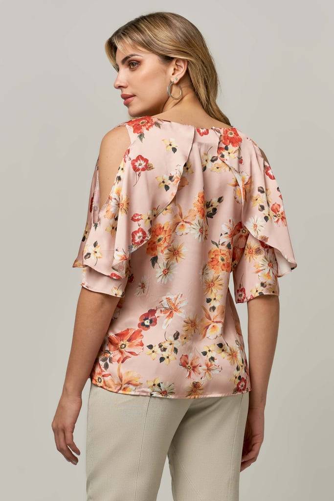 Blusa de satin estampada, decote V, manga 3/4, detalhe de babado e abertura no ombro