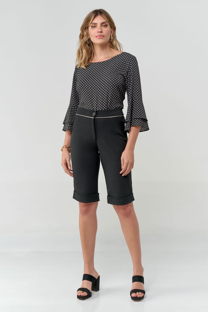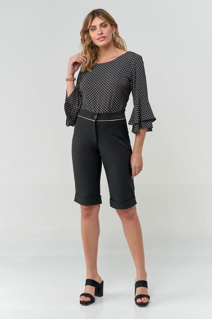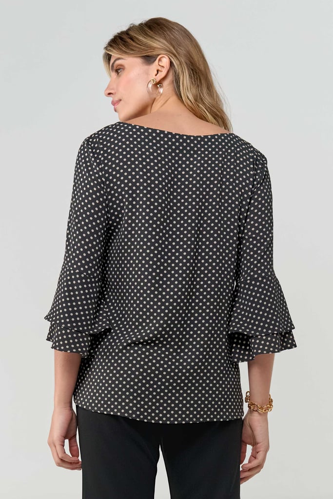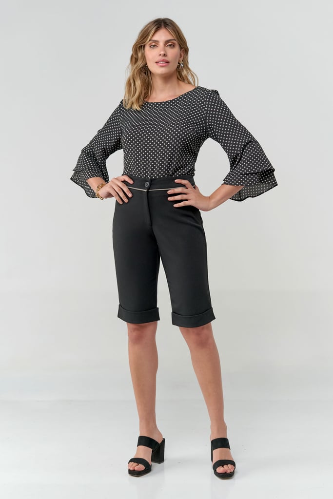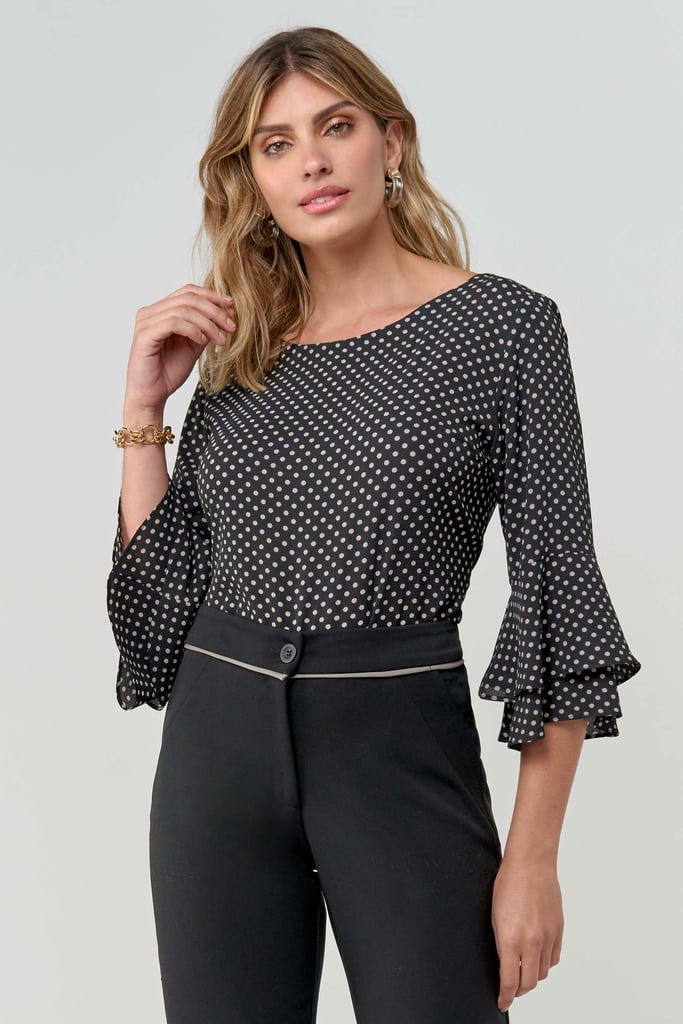 Blusa de crepe, padronagem de poá, decote arredondado e manga 3/4 com babado
