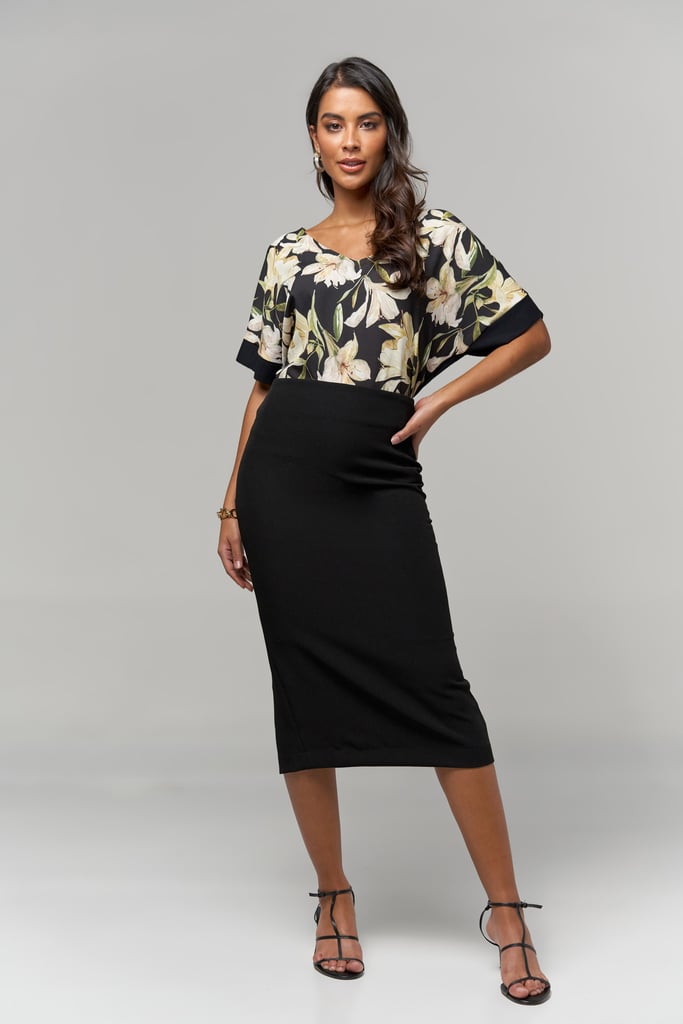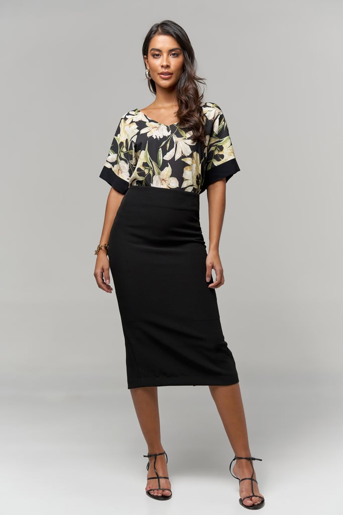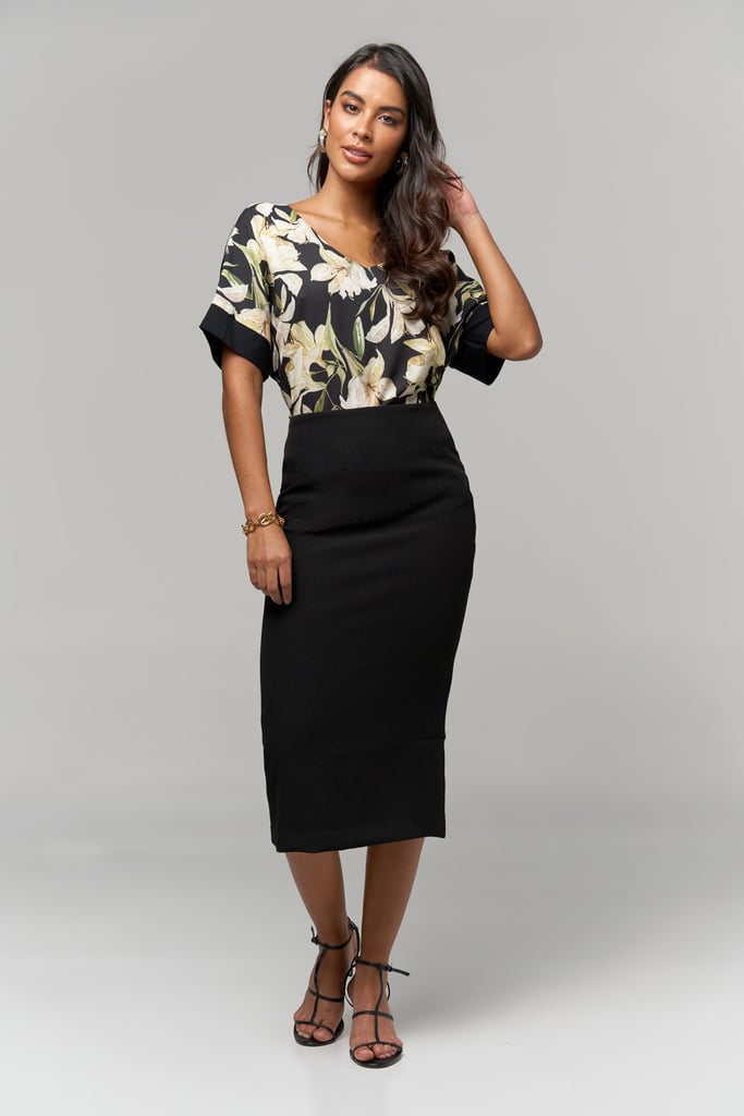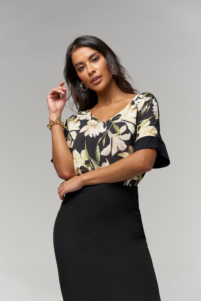 Blusa frente estampada em crepe, decote V, manga curta, detalhe e costas de malha