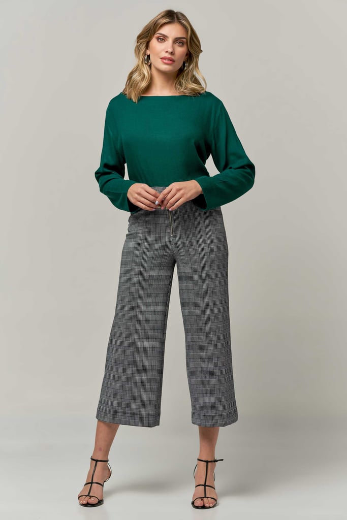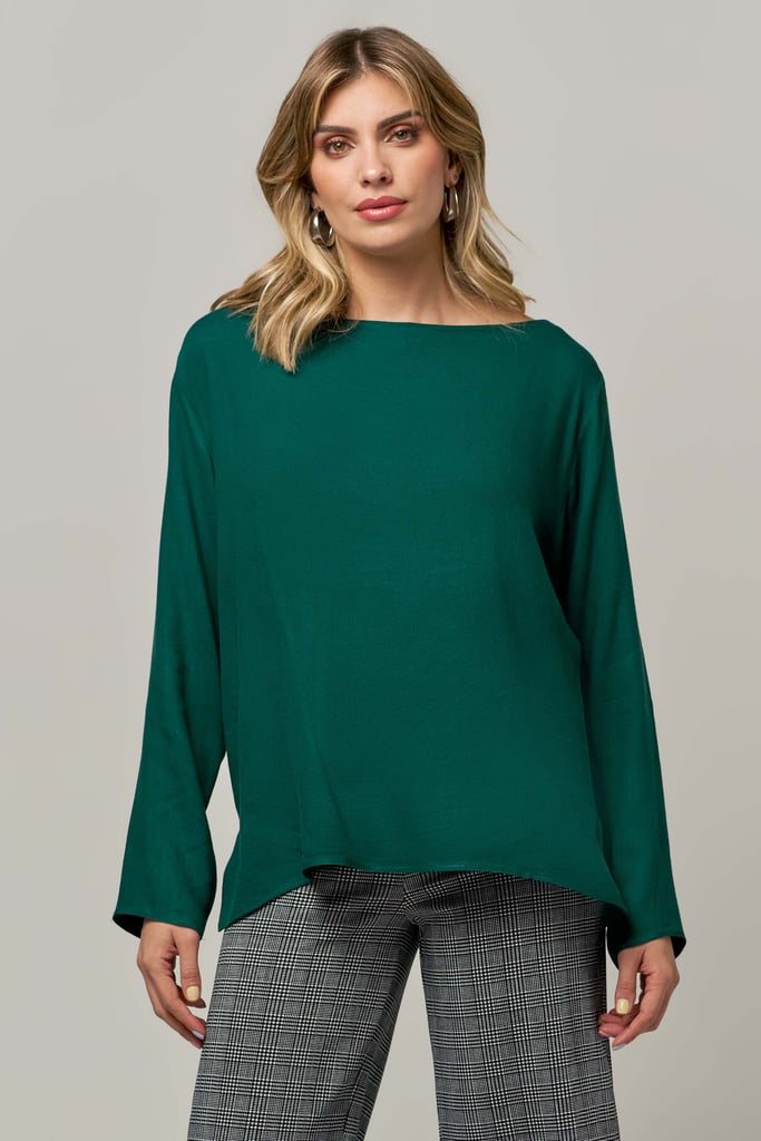 Blusa de crepe, decote redondo, manga longa e abertura lateral