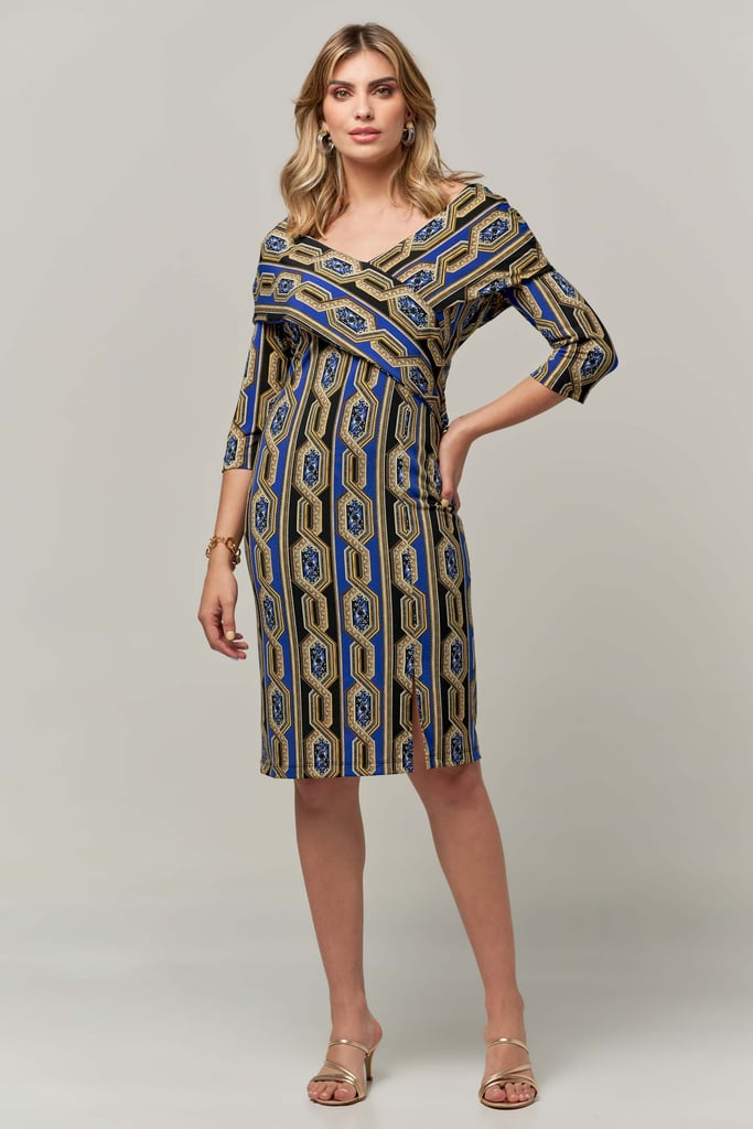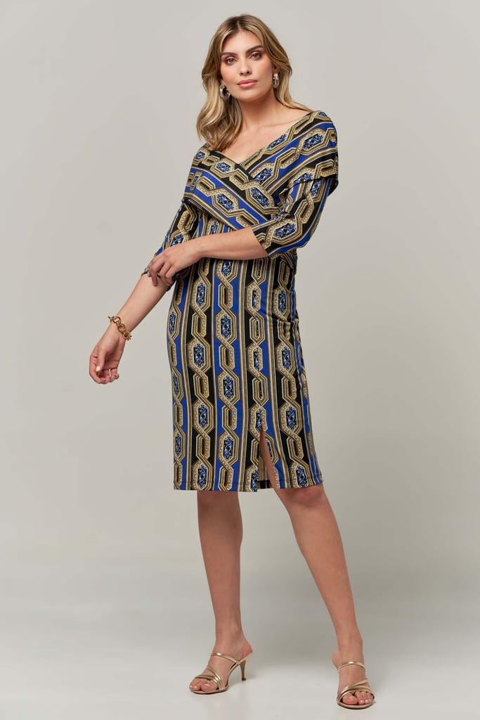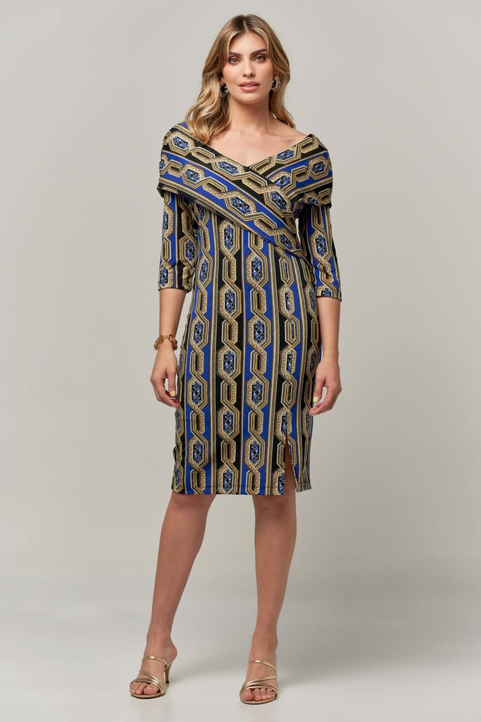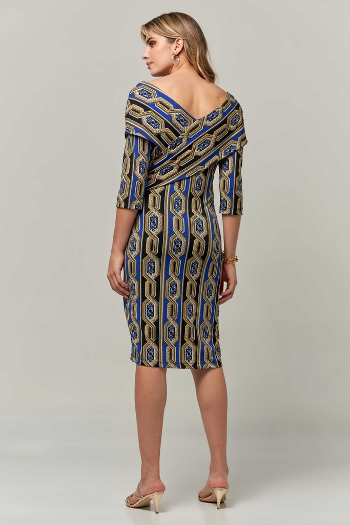 Vestido estampado de malha creponada ferrado, comprimento midi, decote ombro a ombro e manga 3/4.