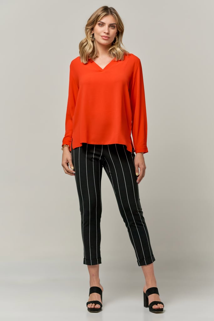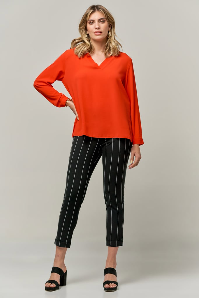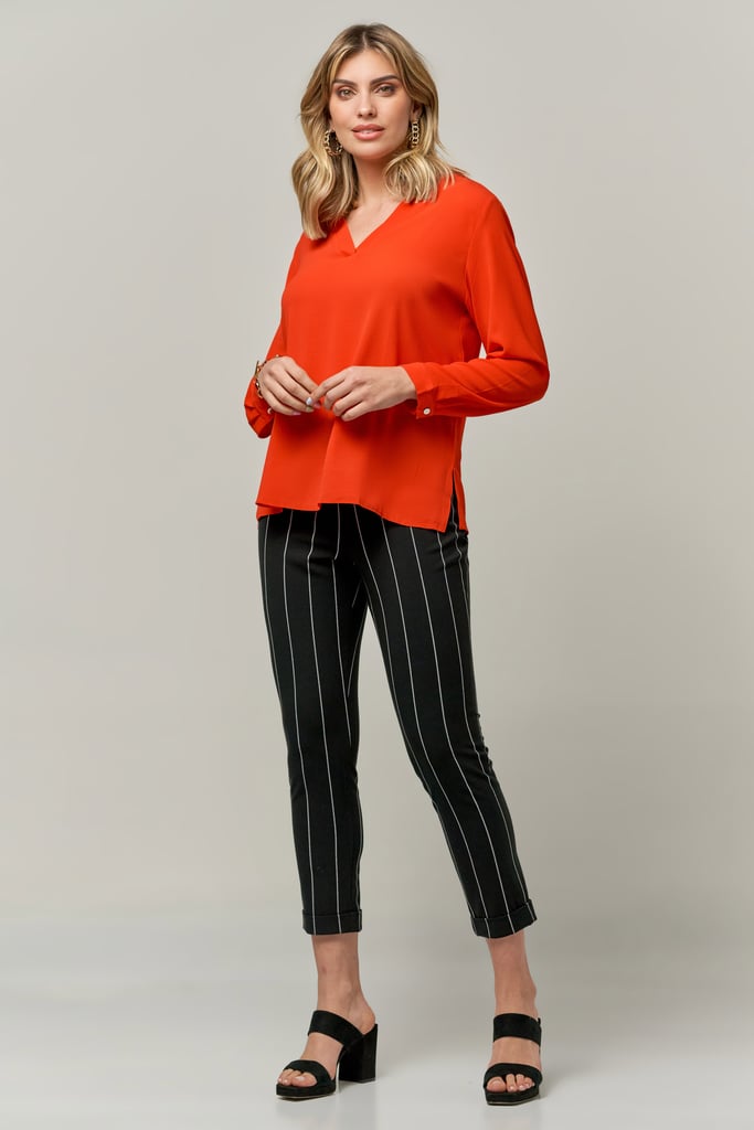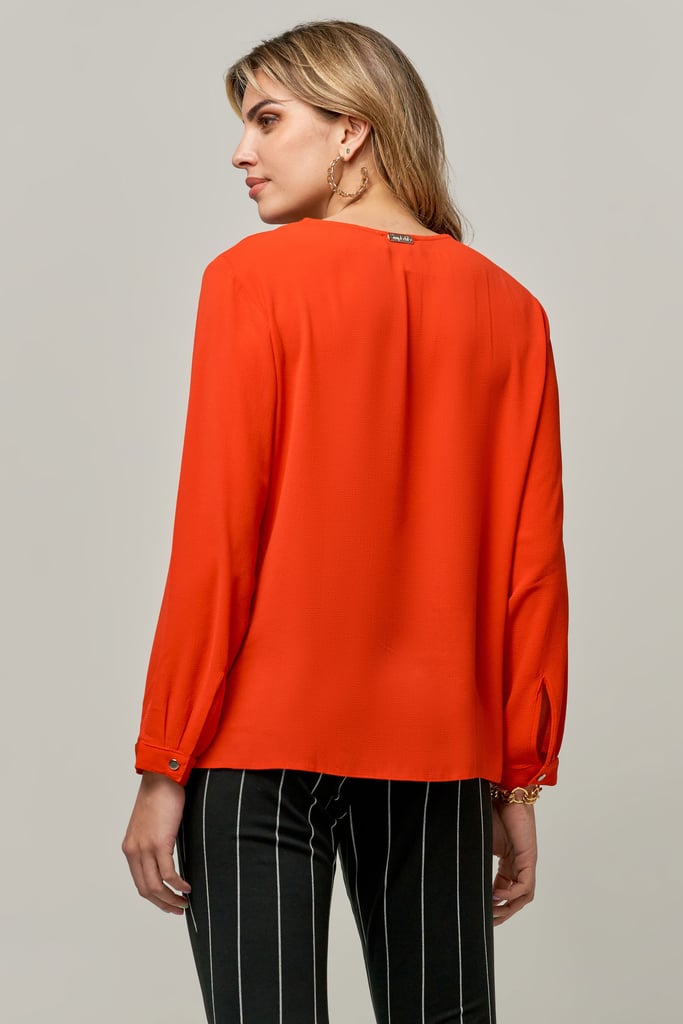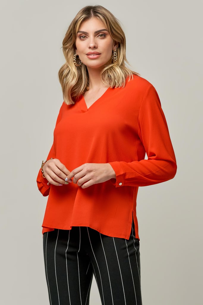 Blusa de crepe, decote V, manga longa com punho fechado por botão