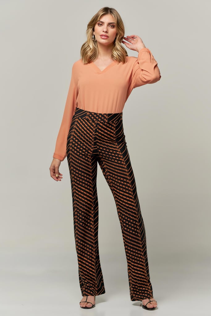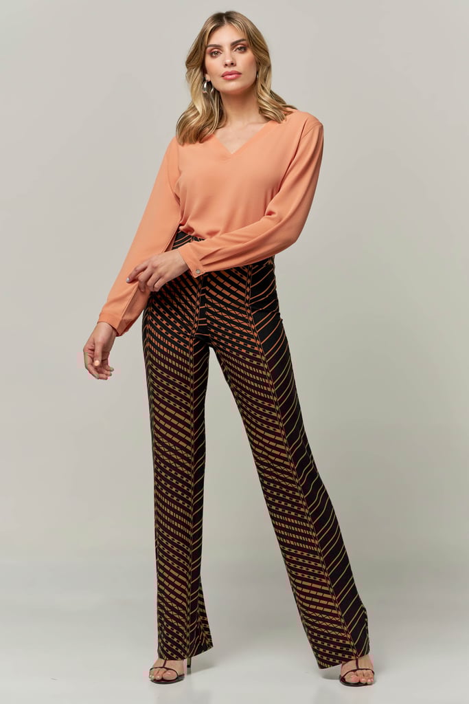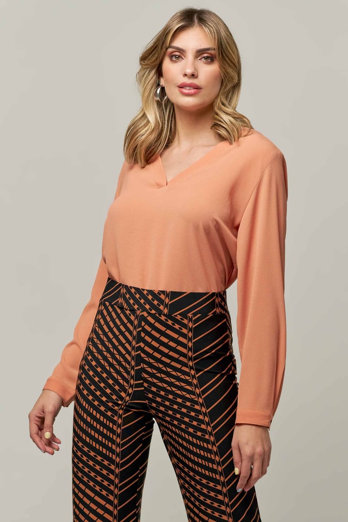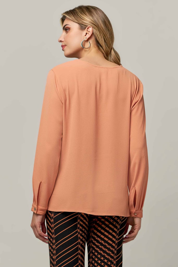 Blusa de crepe, decote V, manga longa com punho fechado por botão