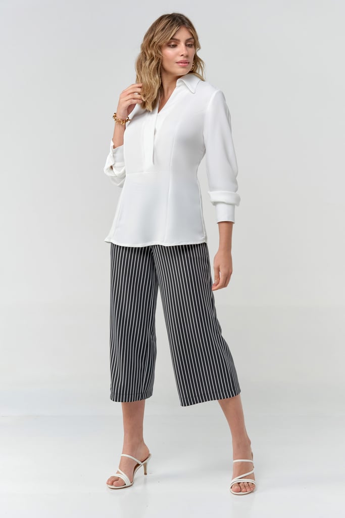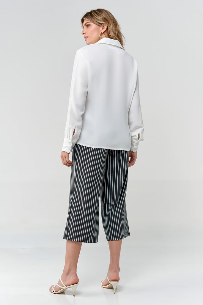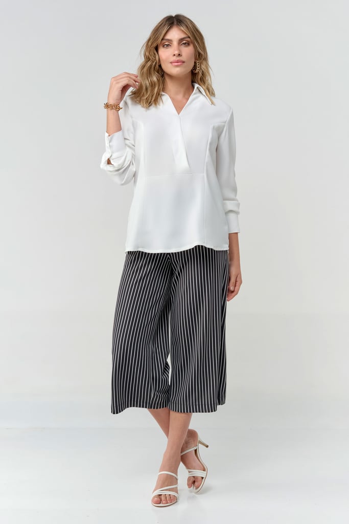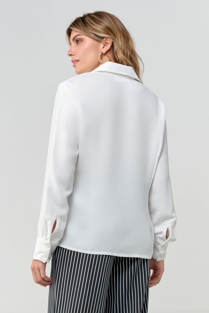 Blusa de crepe com gola, decote V com fecho de colchete e manga longa com punho e botão