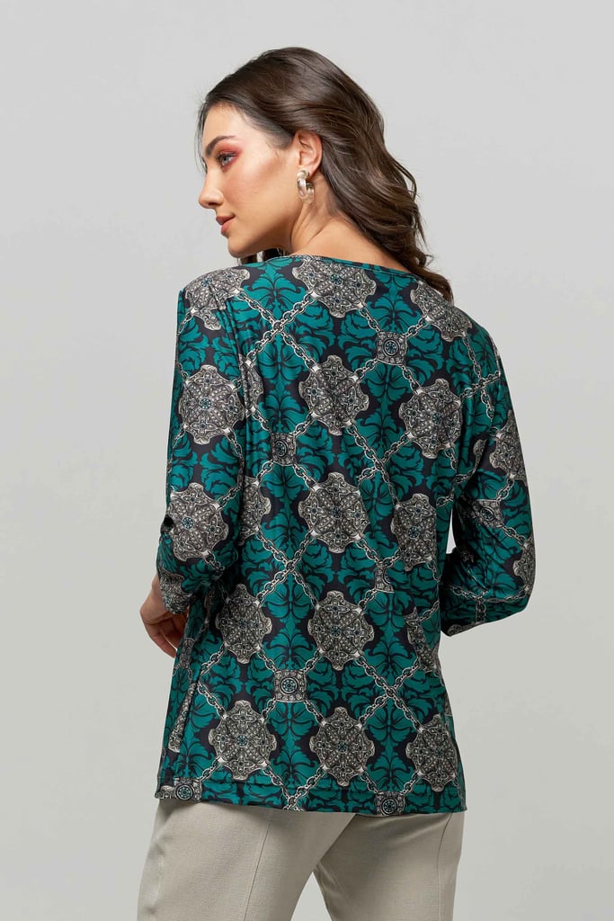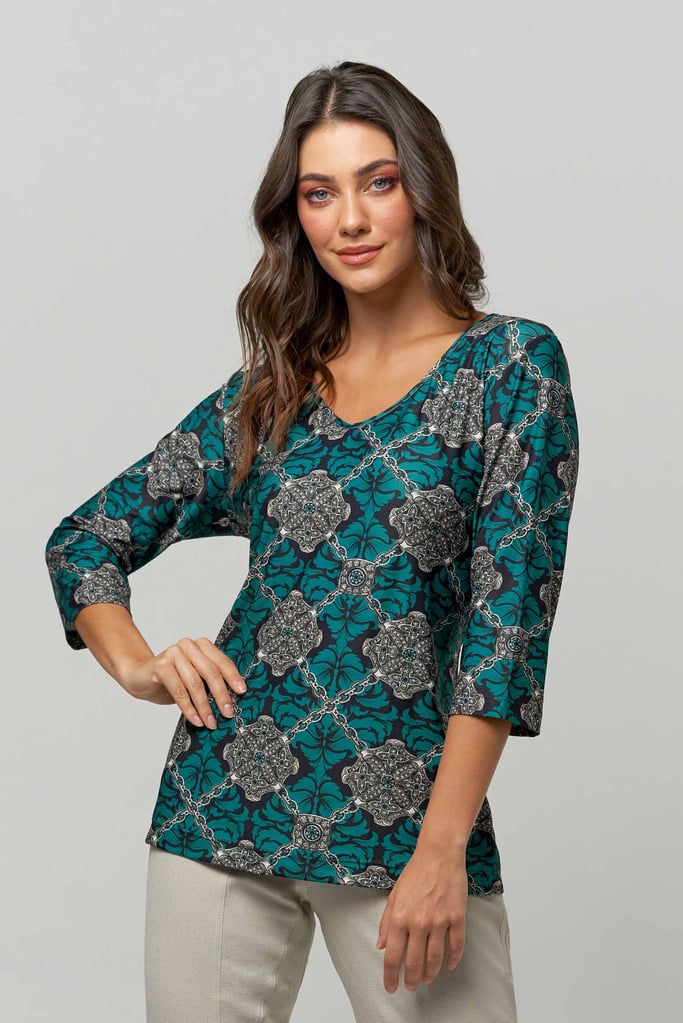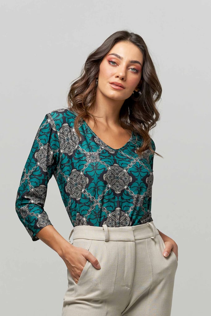 Blusa estampada de malha creponada, decote V e manga 3/4