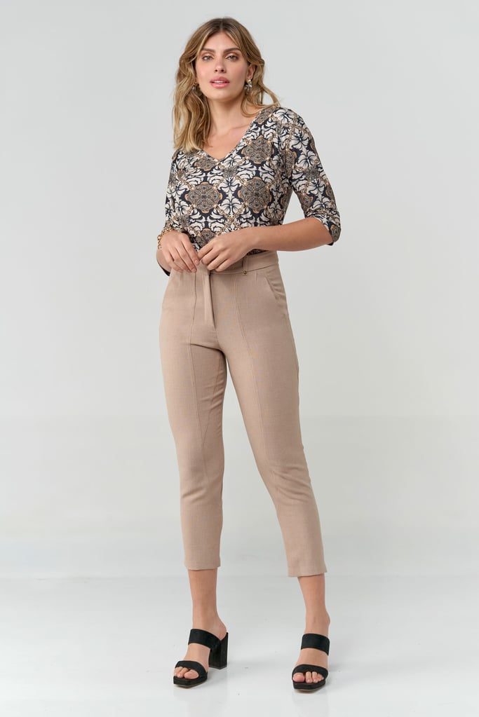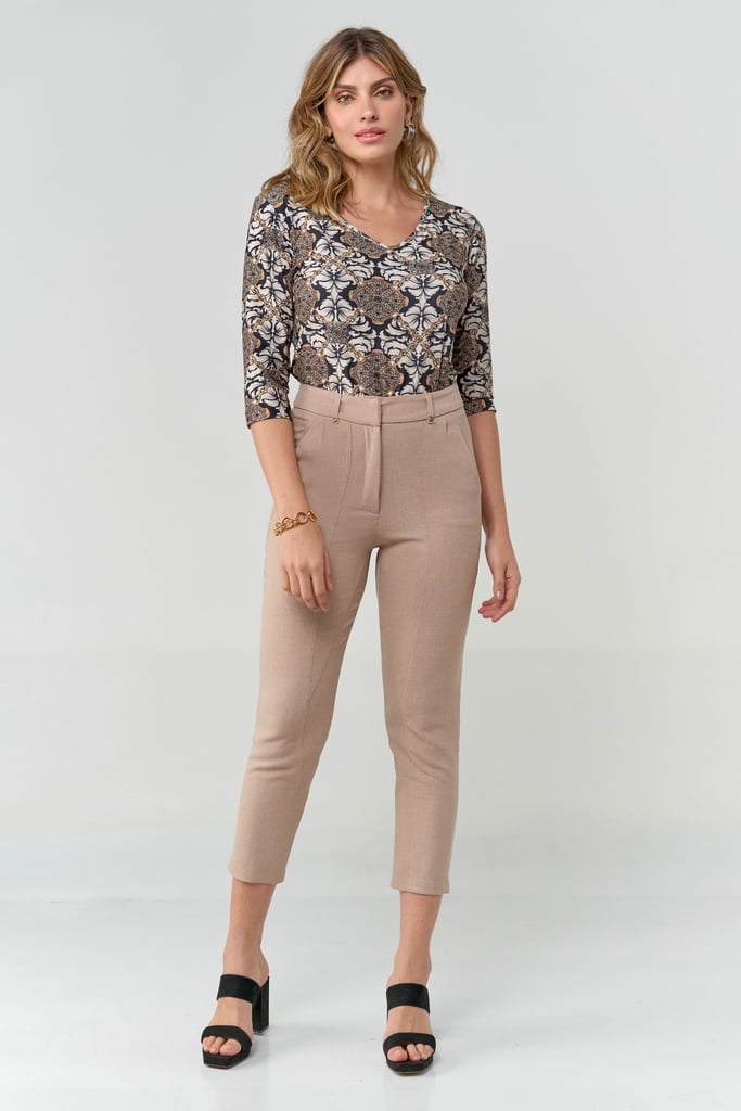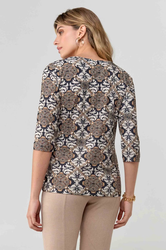 Blusa estampada de malha creponada, decote V e manga 3/4