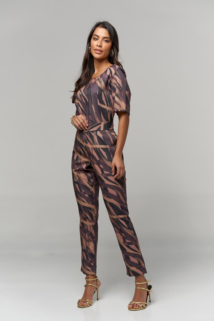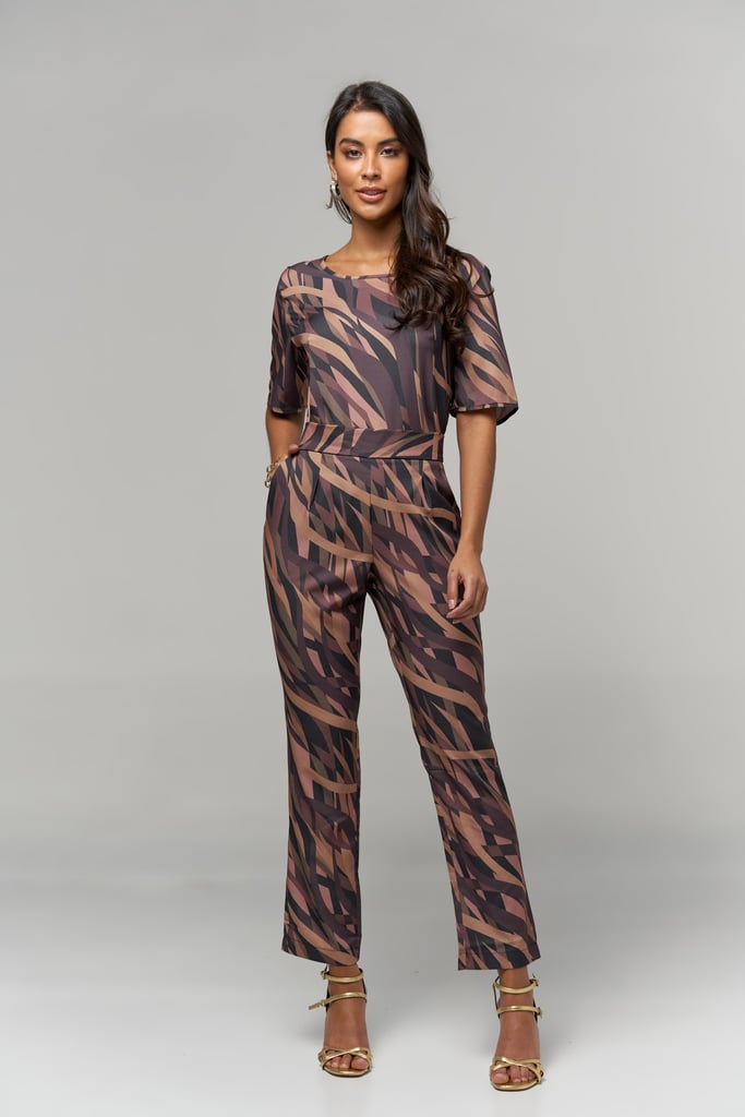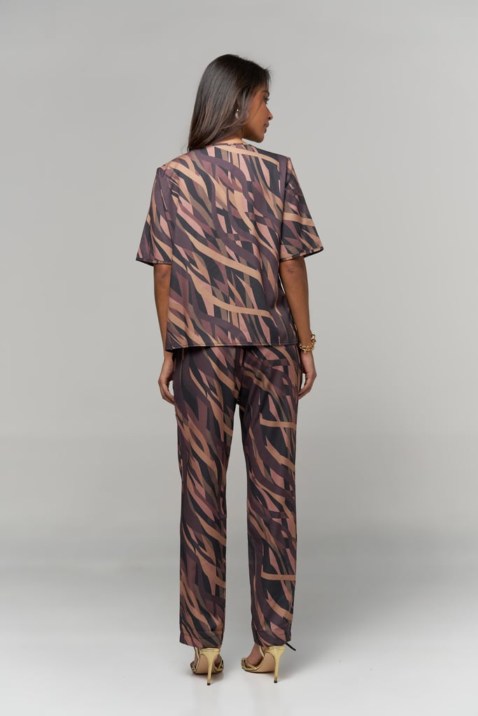 Calça reta de cintura alta, bolsos faca e cós com elástico nas costas.