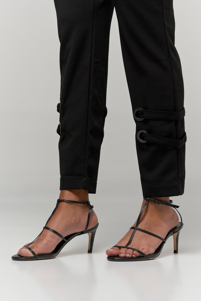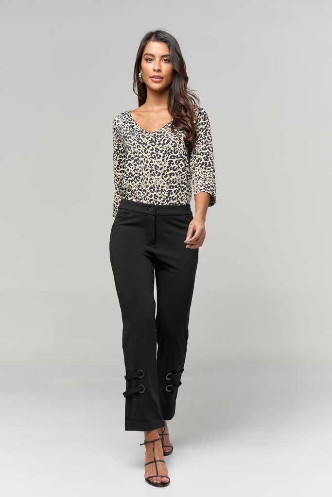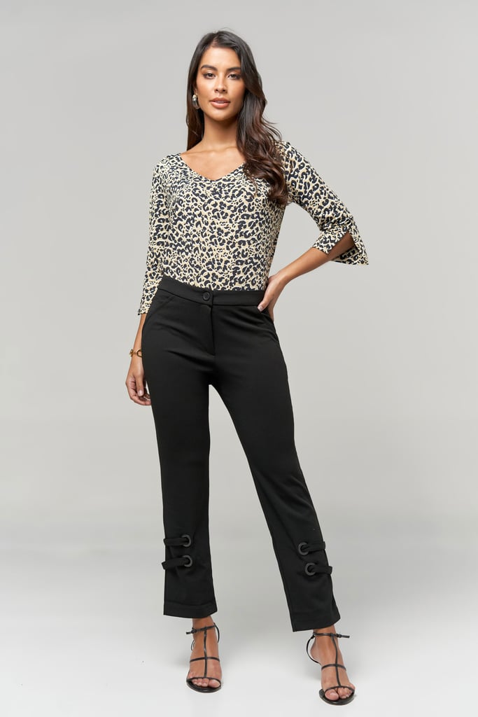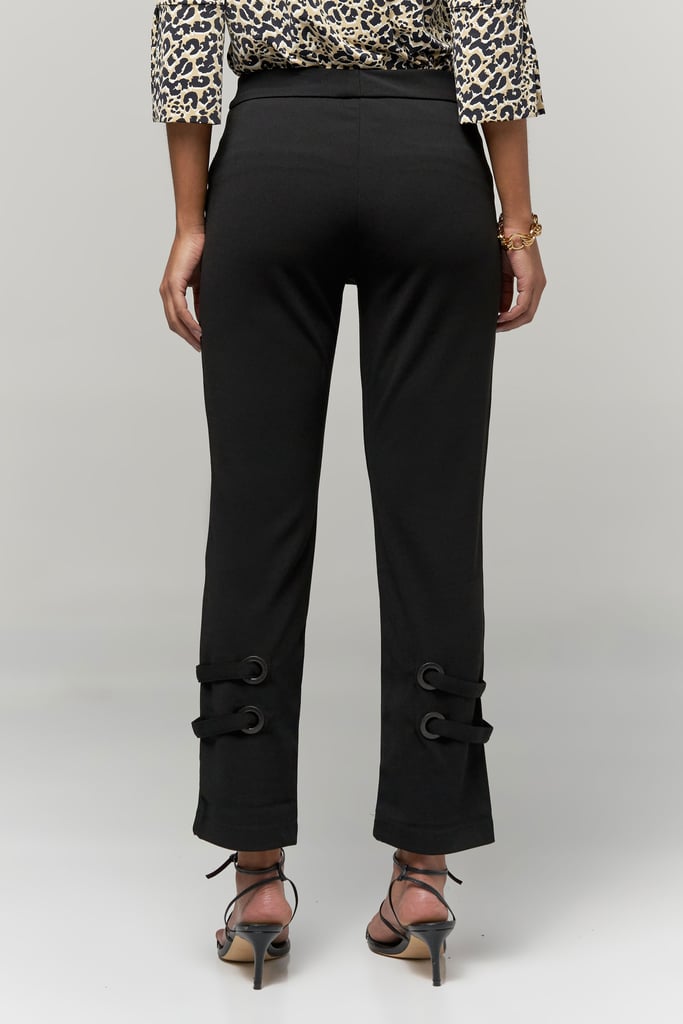 Calça reta de malha creponada, cintura alta, fechamento por botão e zíper, bolso faca falso e detalhe de ilhós com tiras