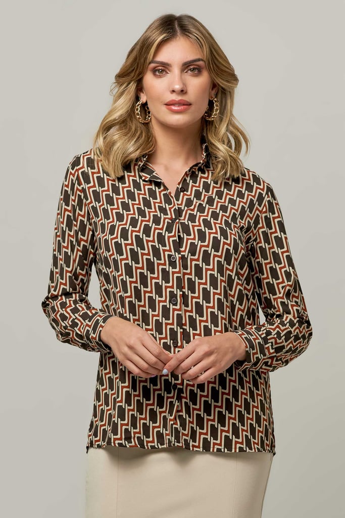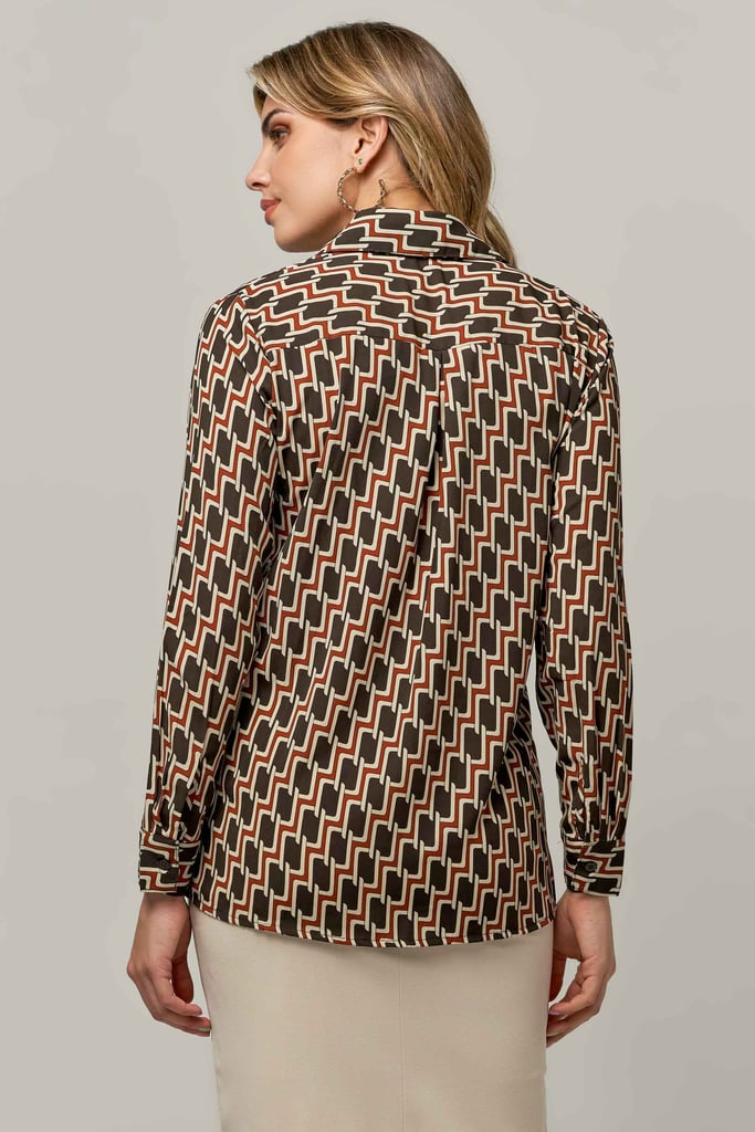 Camisa de crepe estampada, gola de camisa, manga longa e fechamento frontal por botão