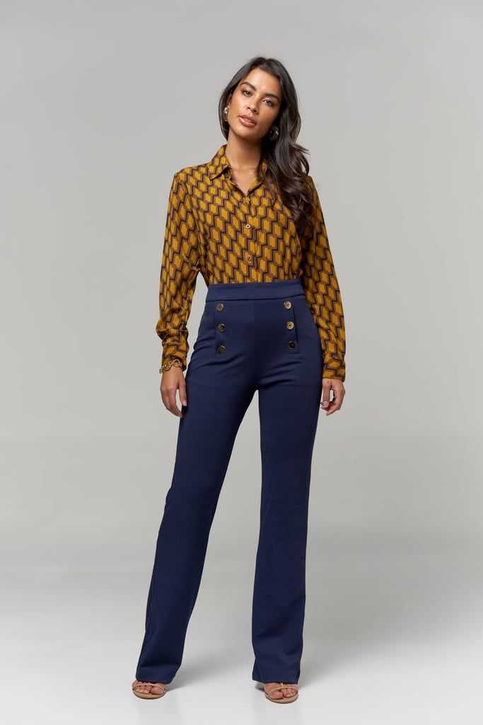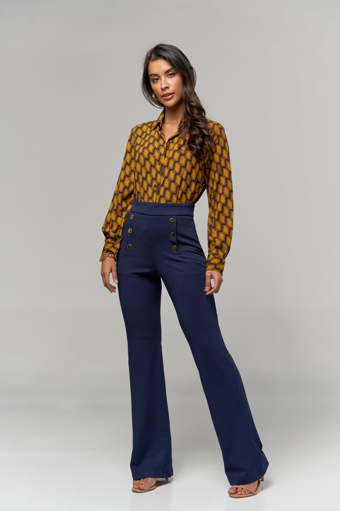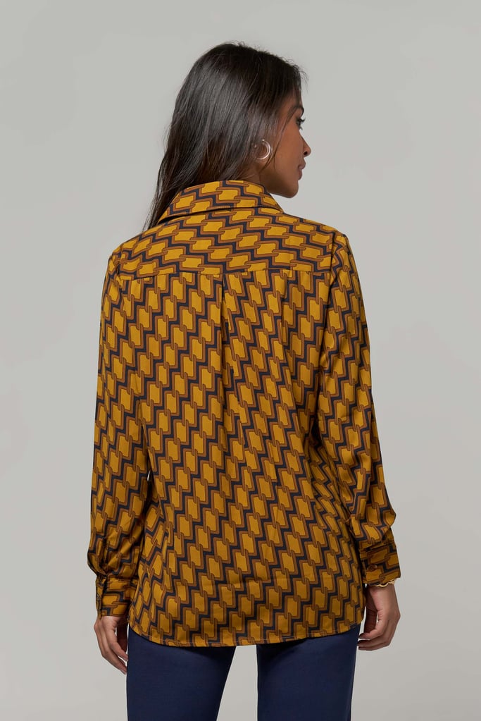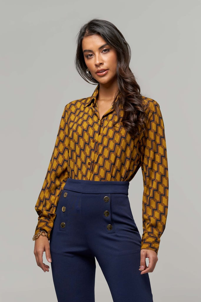 Camisa de crepe estampada, gola de camisa, manga longa e fechamento frontal por botão