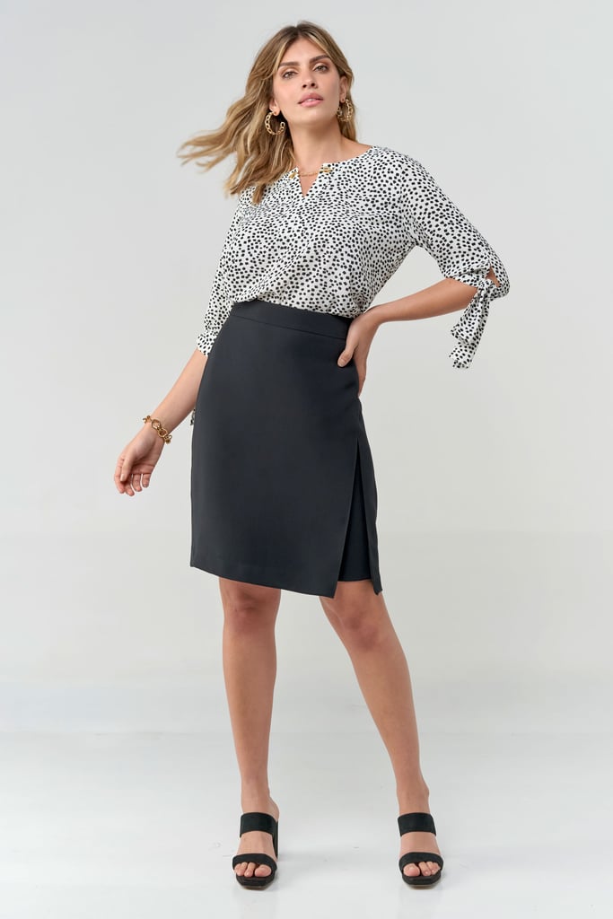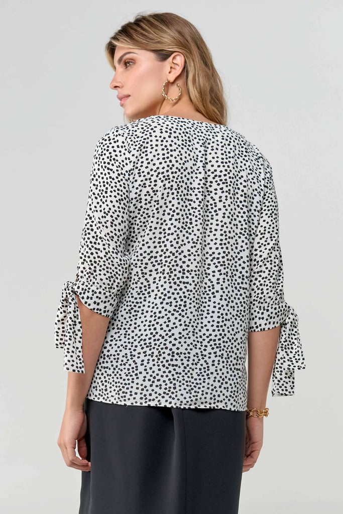 Blusa de crepe estampada, manga com faixa para amarração e aviamento no decote que dá todo o charme à peça