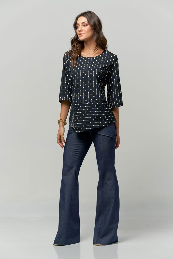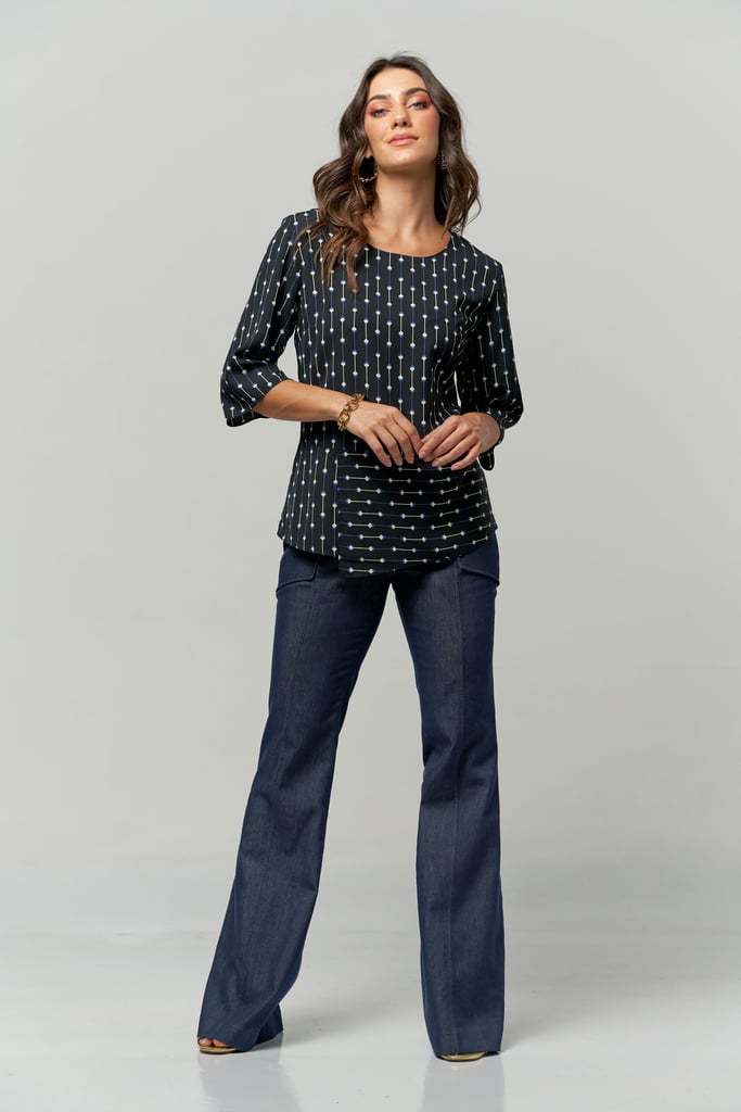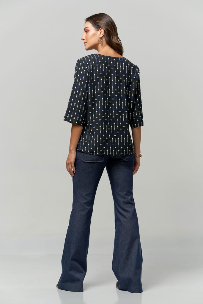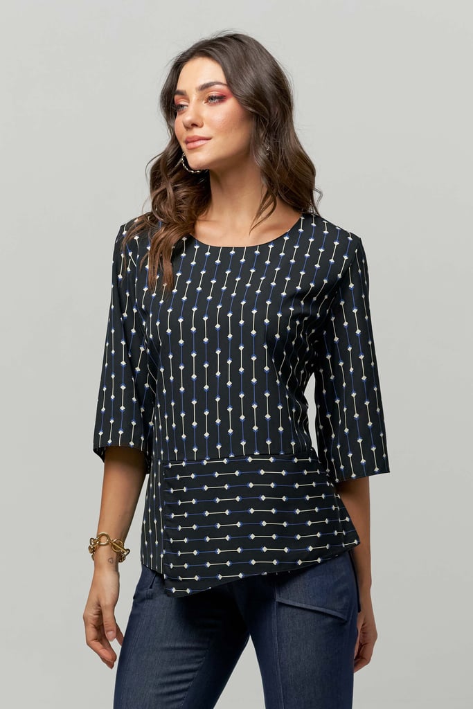 Blusa de crepe estampada, decote redondo e manga 3/4