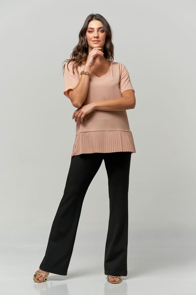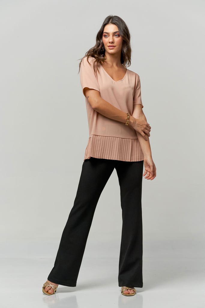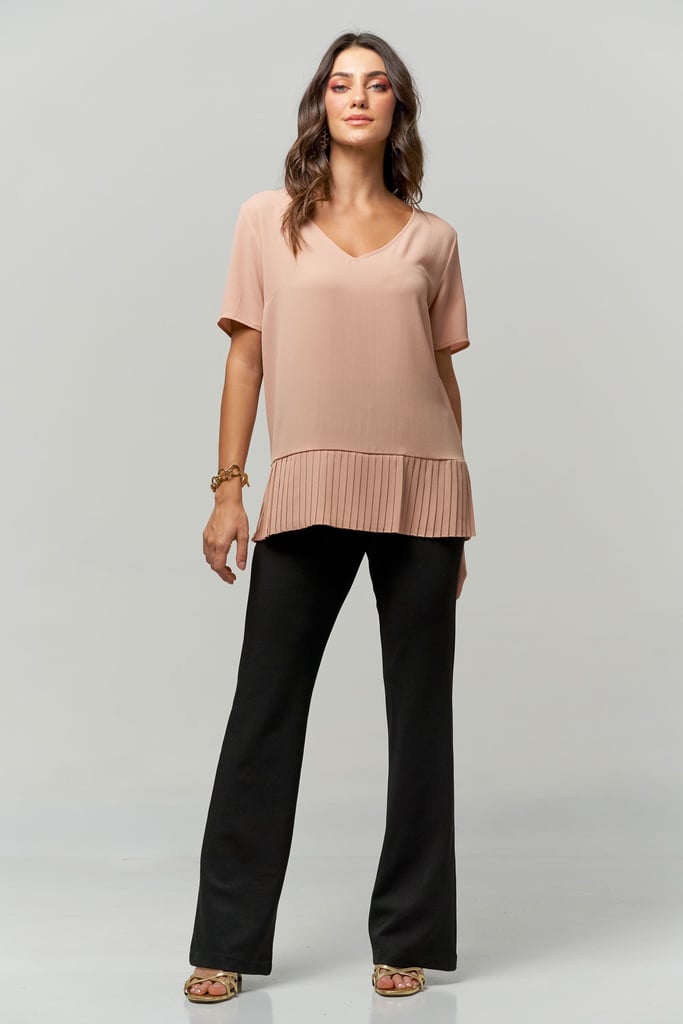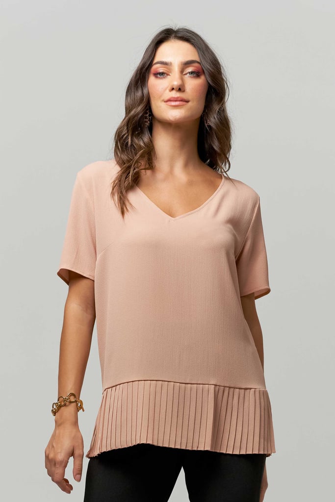 Blusa de crepe, decote V, manga curta e detalhe de plissado na barra