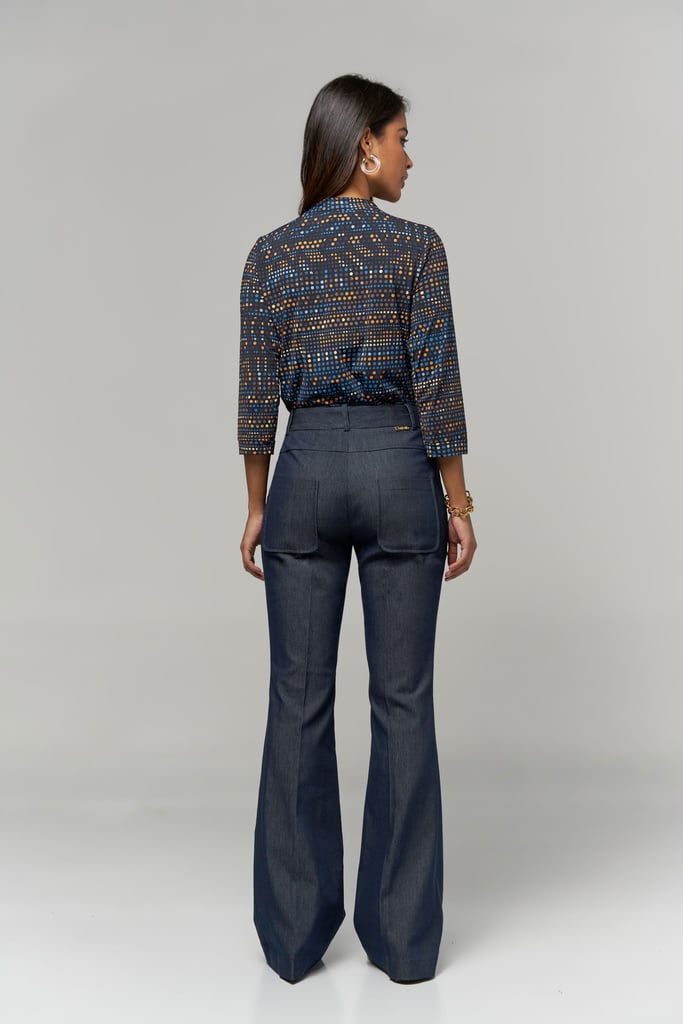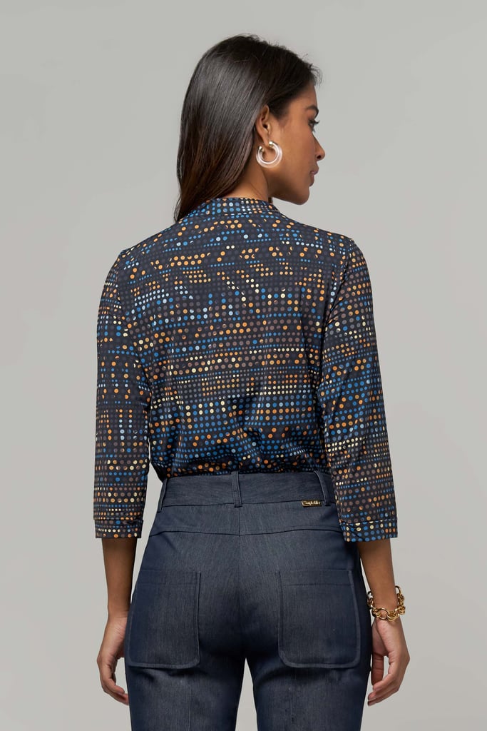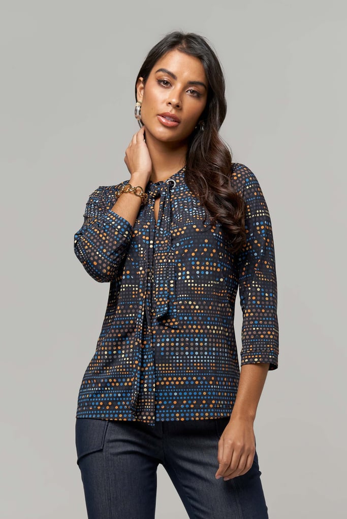 Blusa estampada de malha fria, manga 3/4, detalhe de ilhós e faixa para amarração no decote