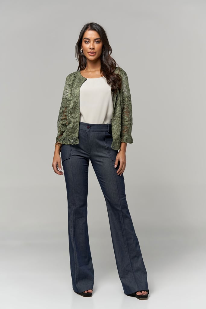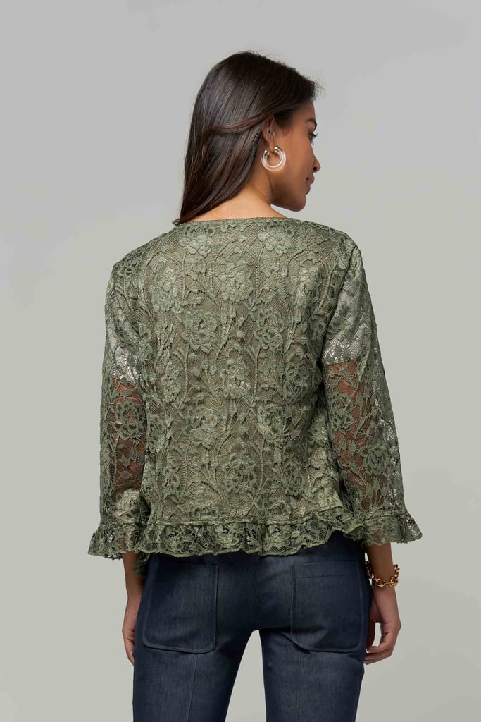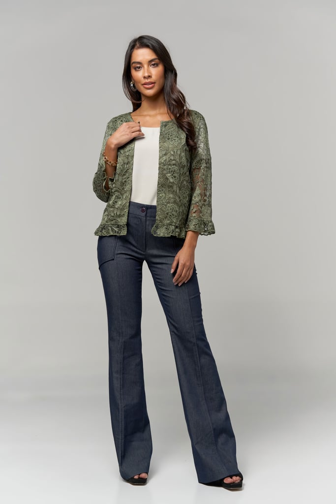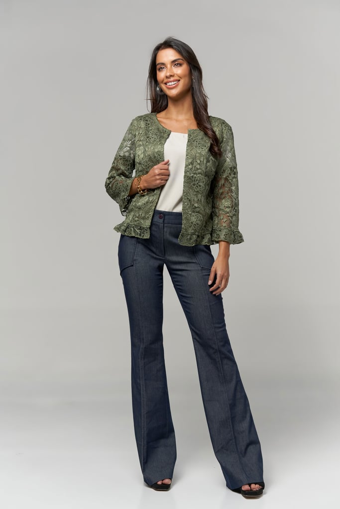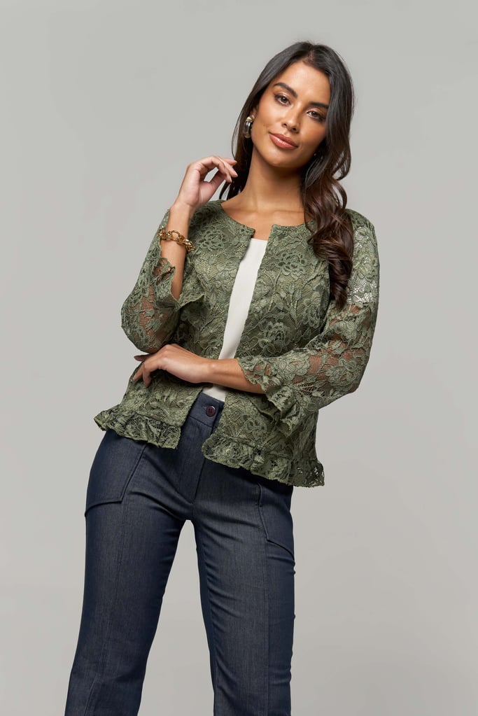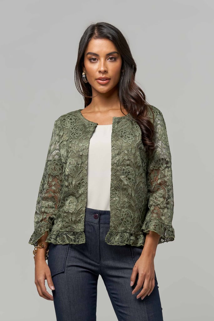 Casaco de renda, decote redondo, manga comprida e detalhe de babado na manga e barra. Peça forrada