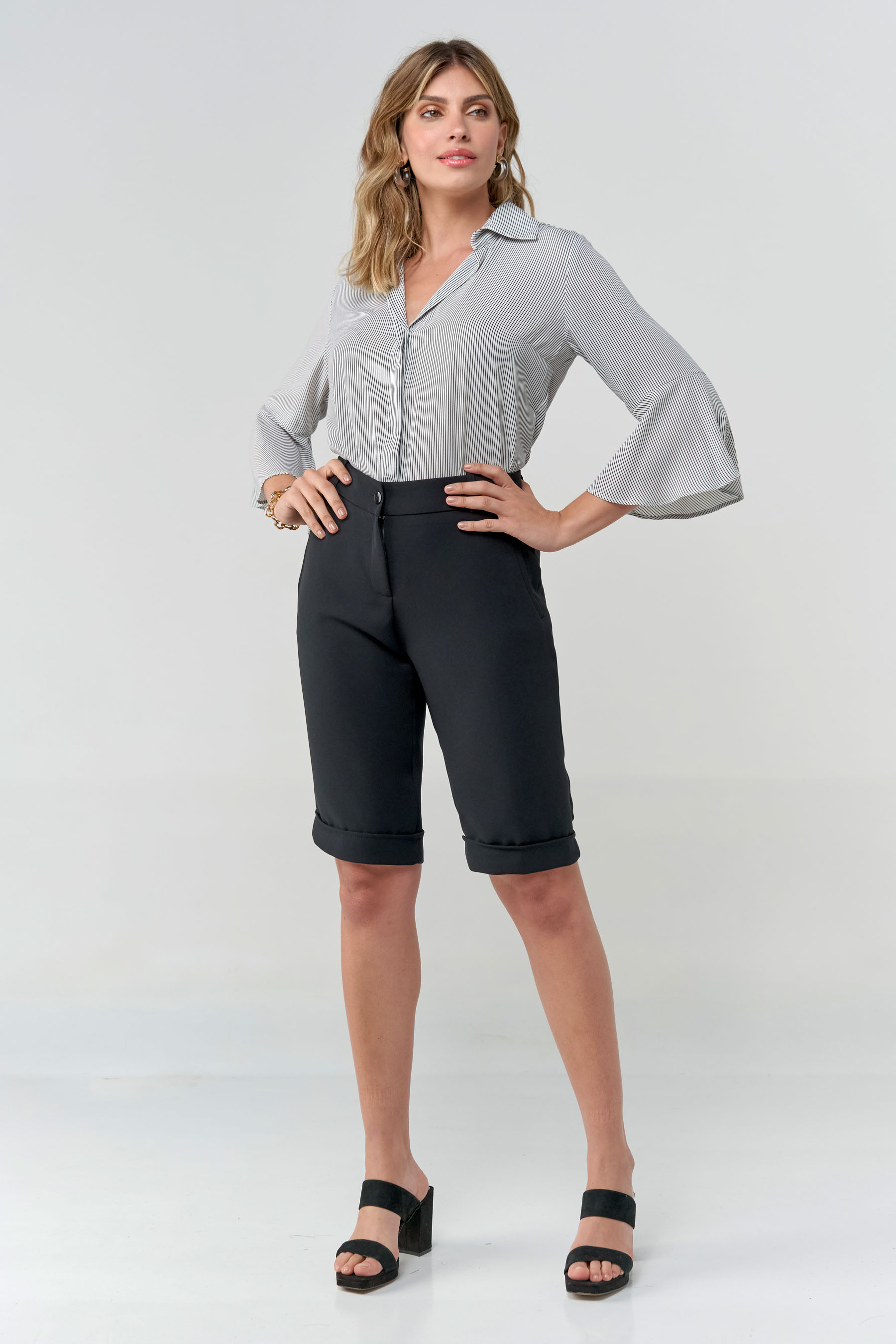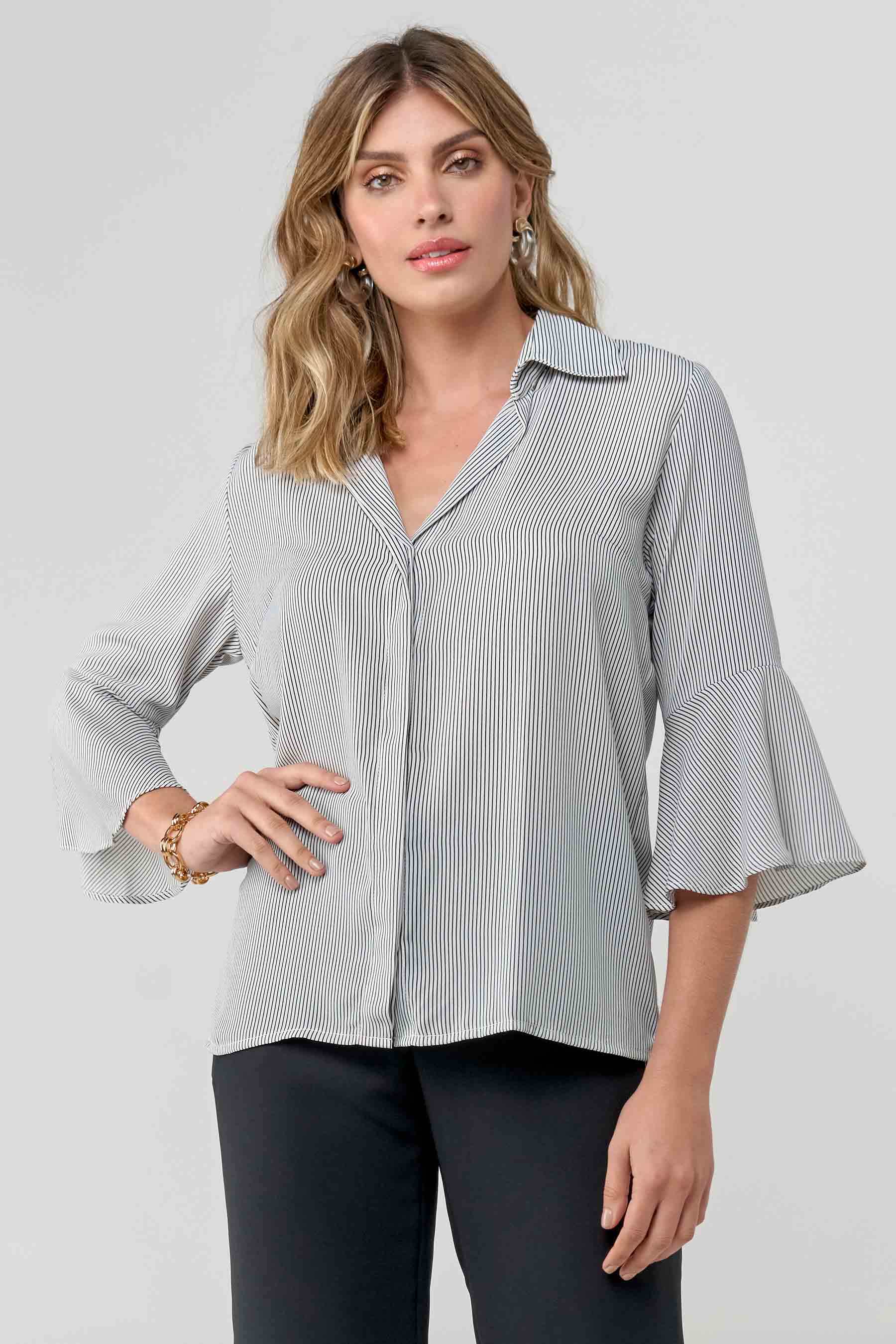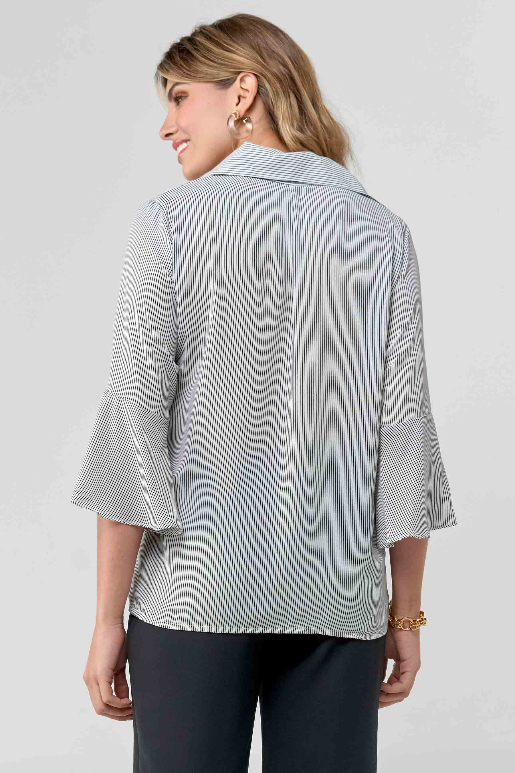 Camisa listrada creponada, gola de camisa, fechamento frontal por botão e manga tipo sino