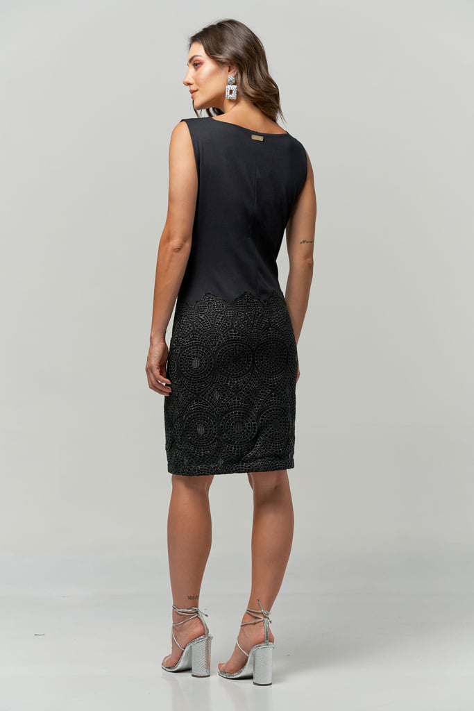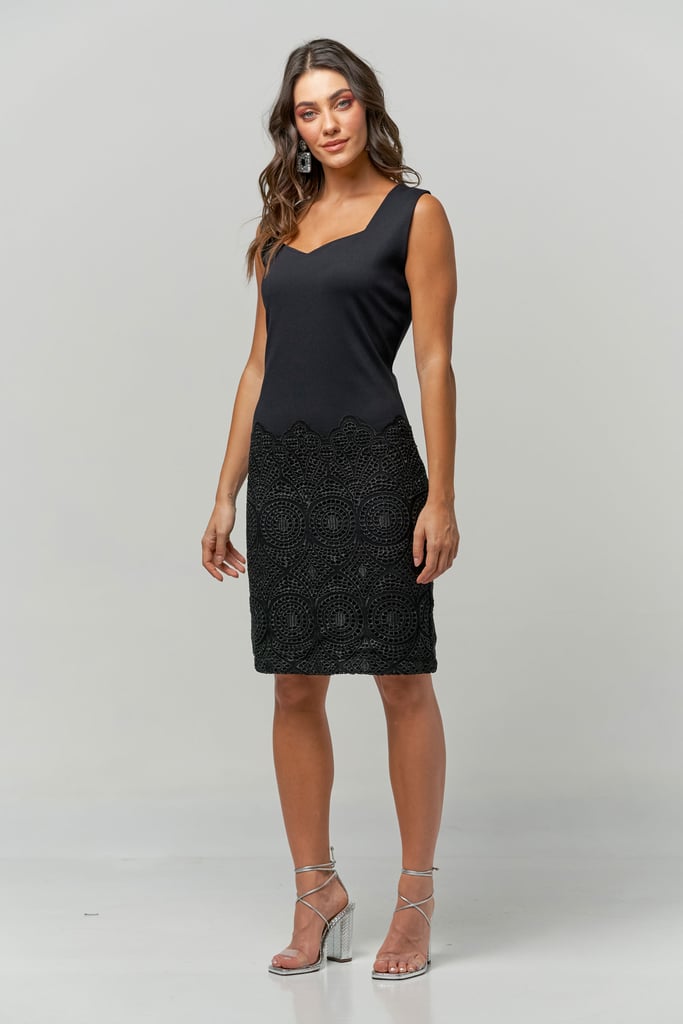 Vestido tubo de malha forrado com barrado de renda, sem mangas e decote coração.