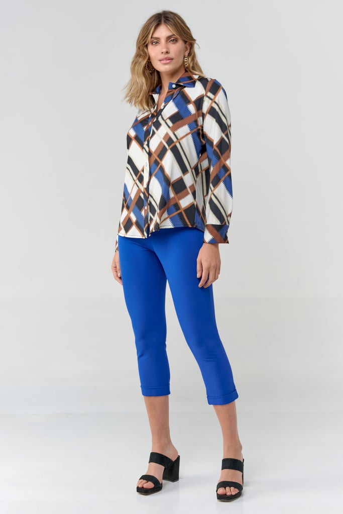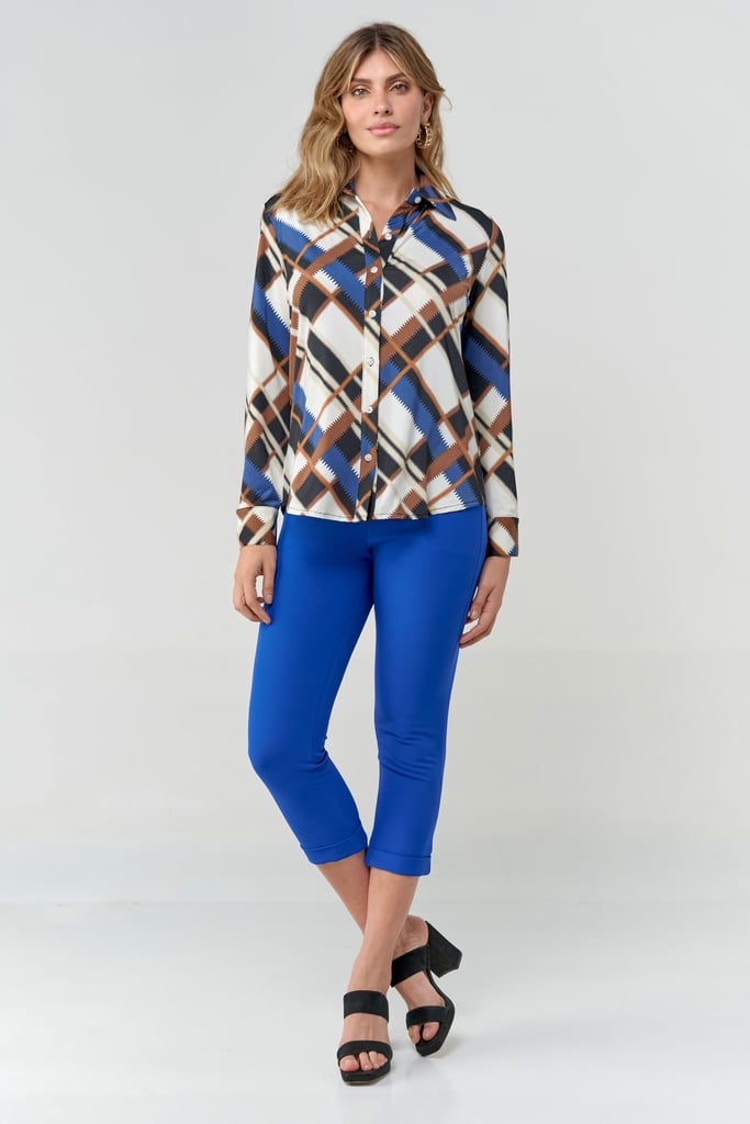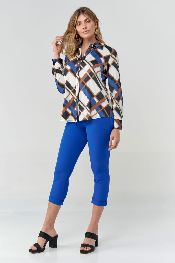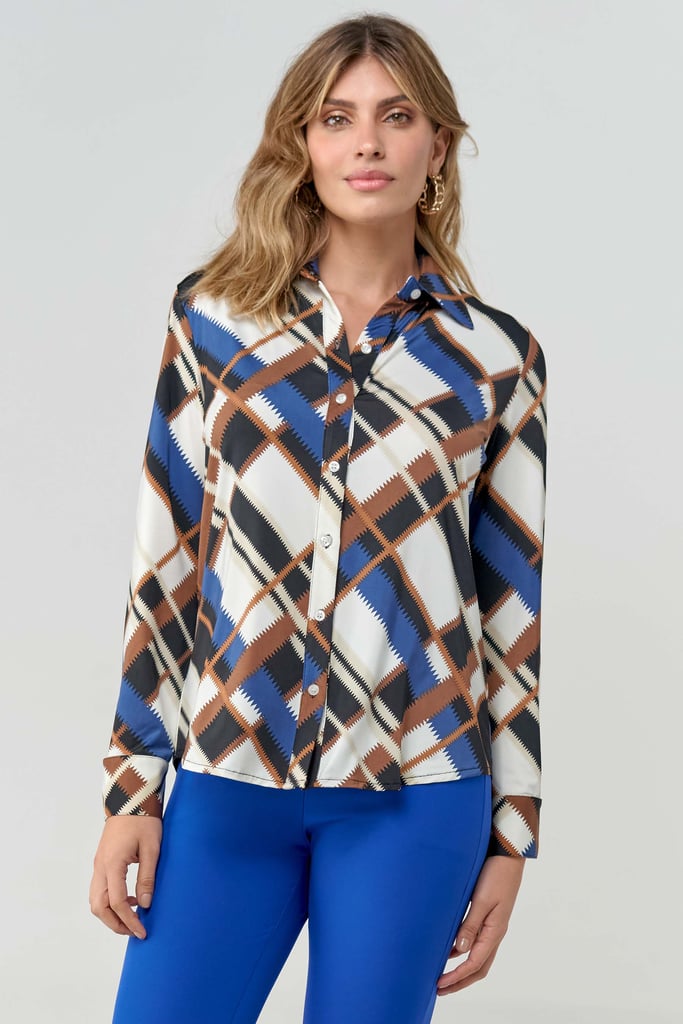 Camisa estampada em malha fria, gola, vista com botões, manga comprida com punho fechada por botão