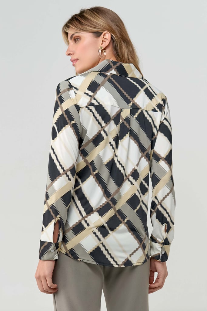 Camisa estampada em malha fria, gola, vista com botões, manga comprida com punho fechada por botão