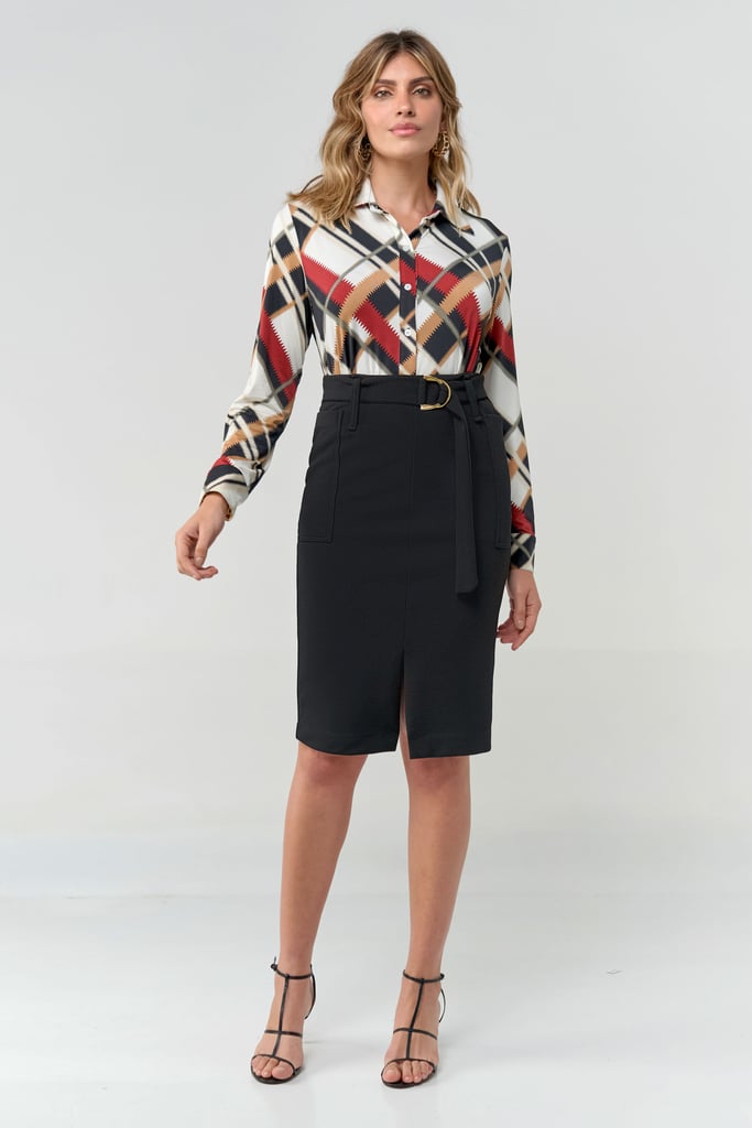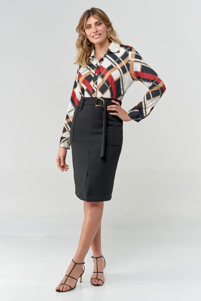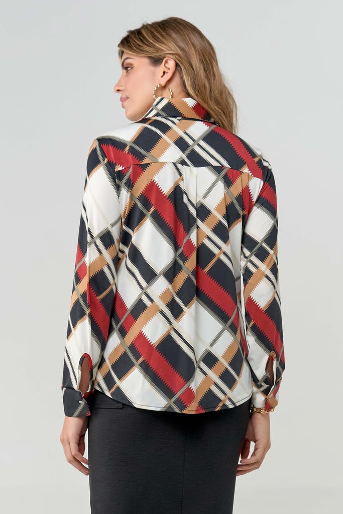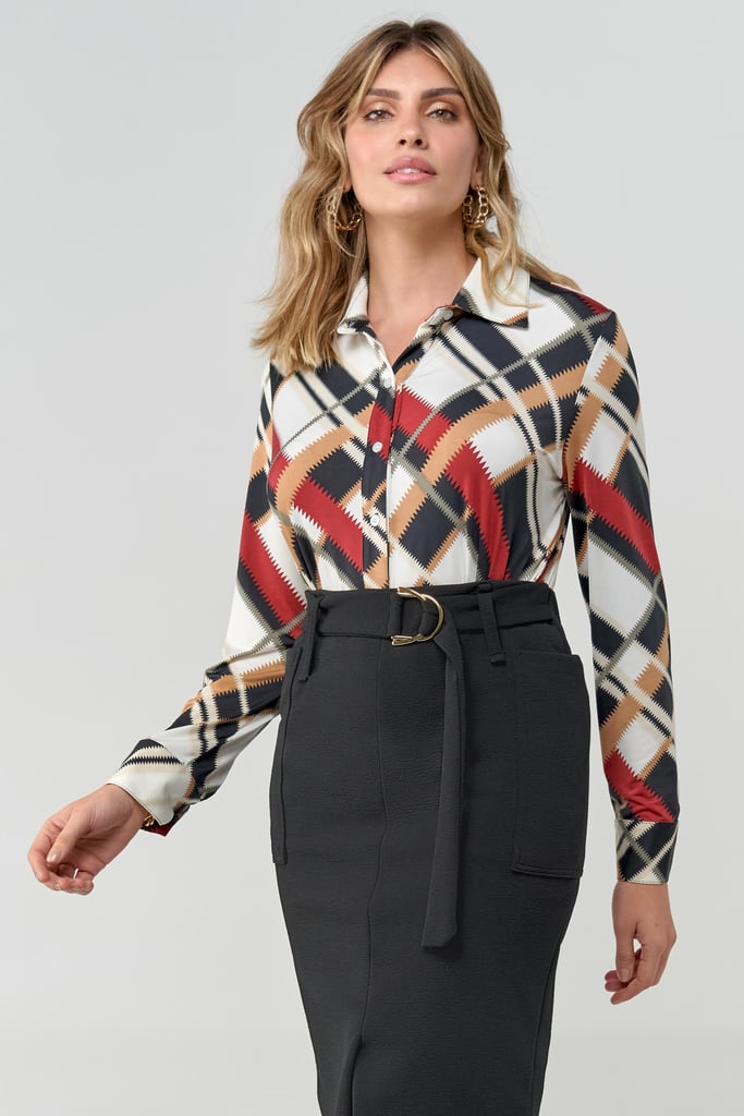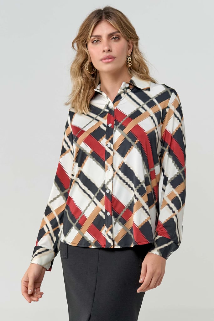 Camisa estampada em malha fria, gola, vista com botões, manga comprida com punho fechada por botão