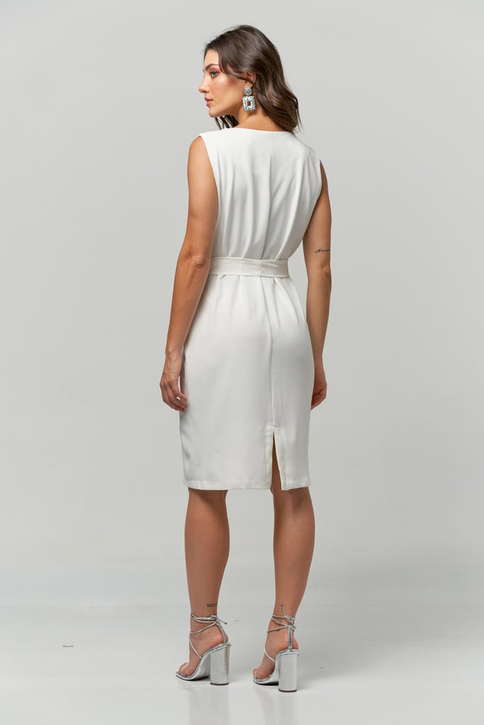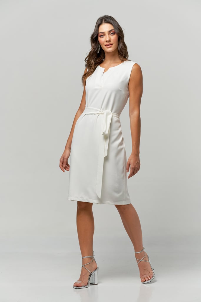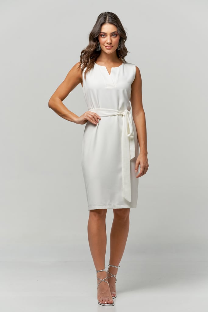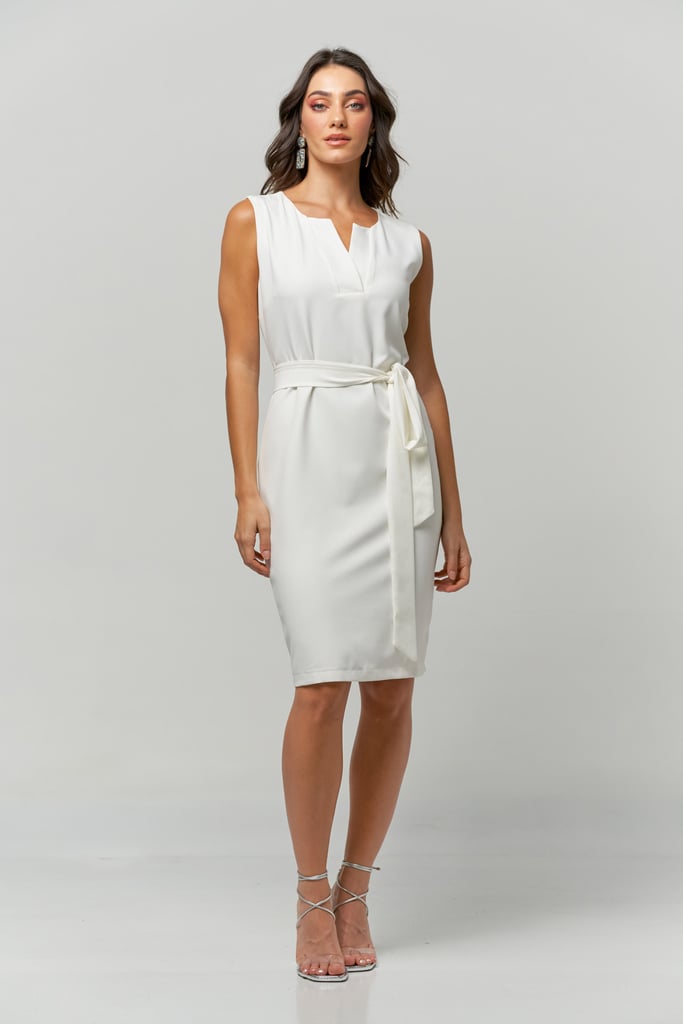Vestido tubo de crepe forrado, sem manga, decote V, comprimento midi e faixa para amarração na cintura