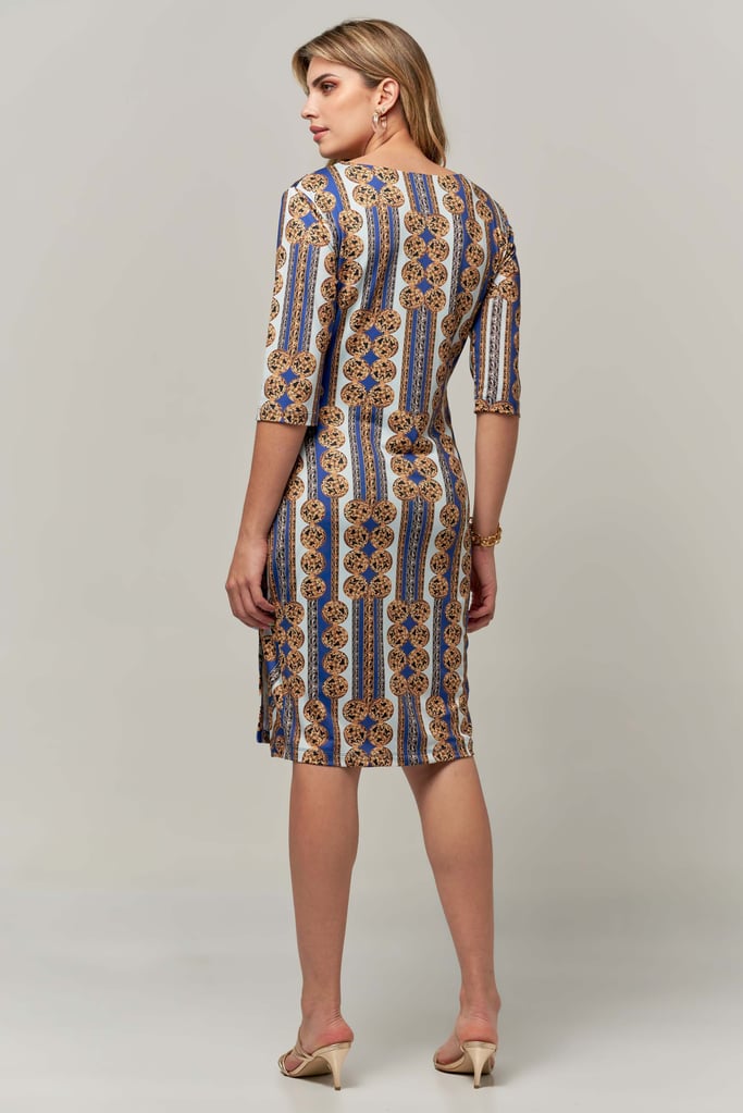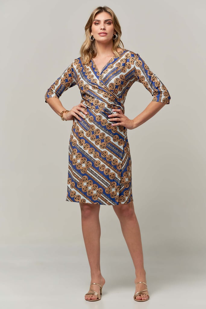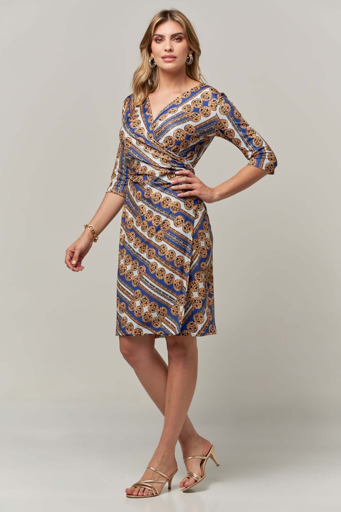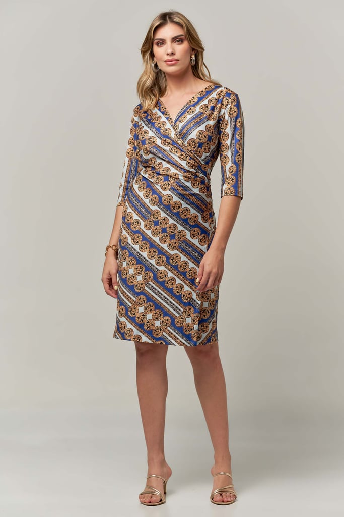 Vestido transpassado estampado de malha fria forrado, comprimento midi, decote V e manga curta.