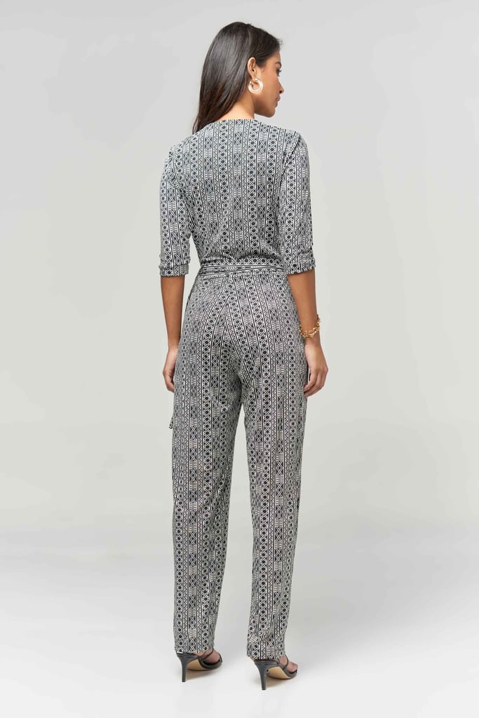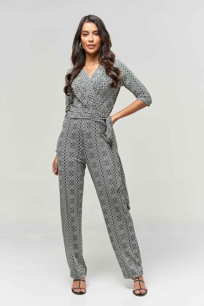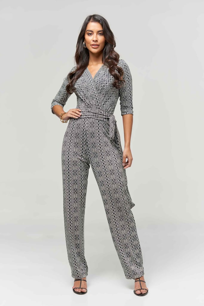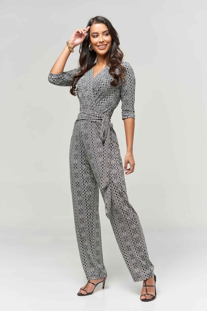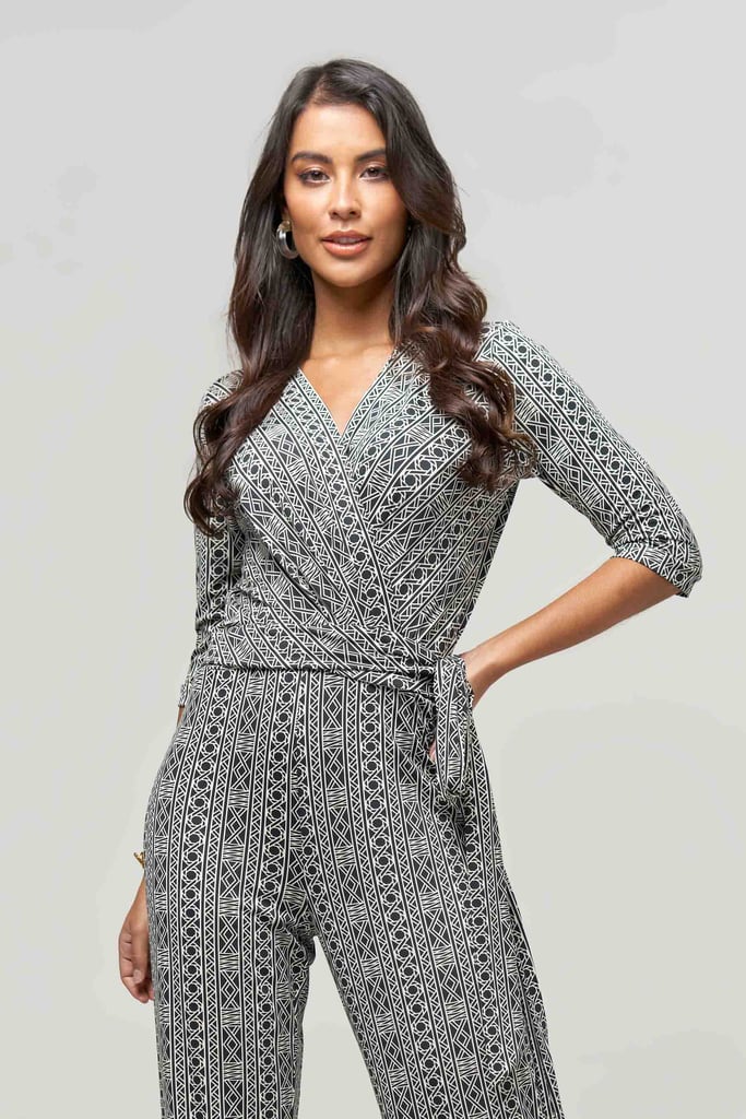 Macacão de malha fria estampado, decote V transpassado, faixa para amarração, comprimento longo, manga 3/4.