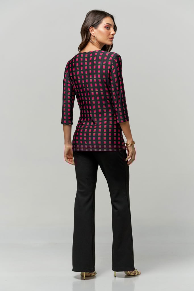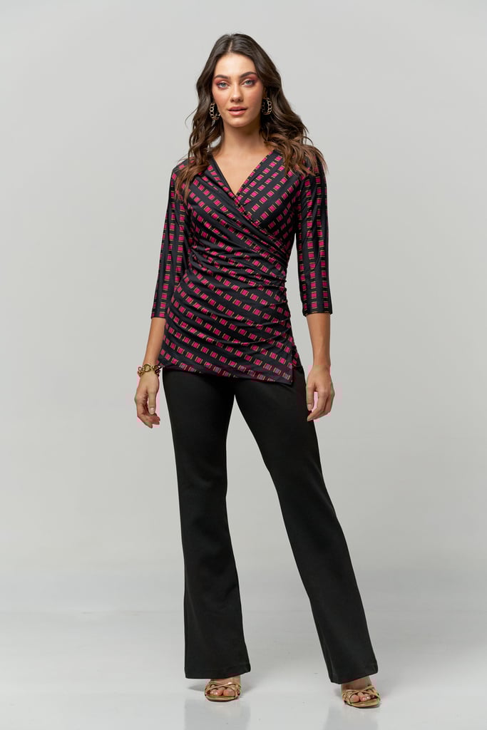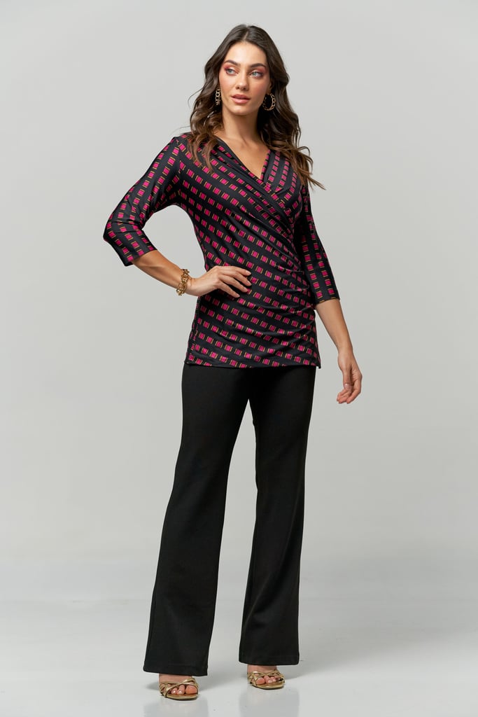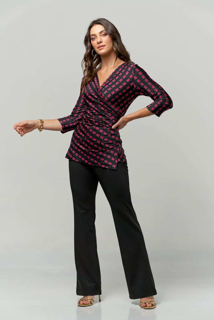 Blusa estampada em malha fria, decote transpassado e manga 3/4