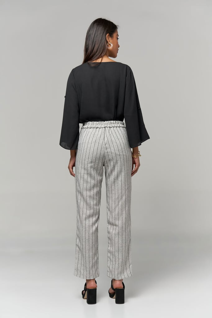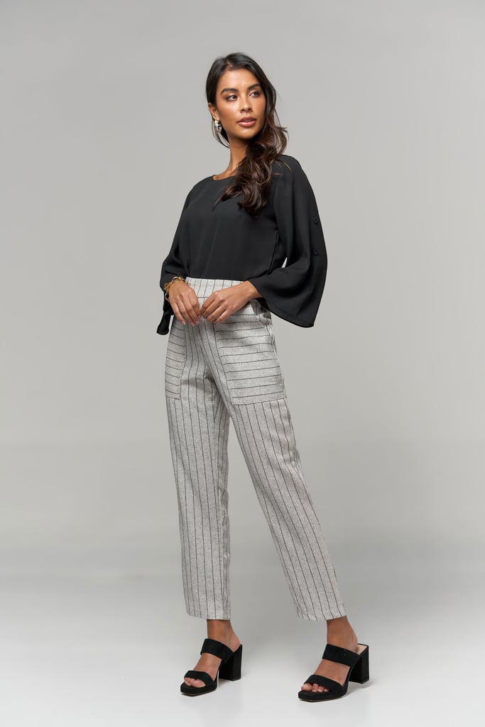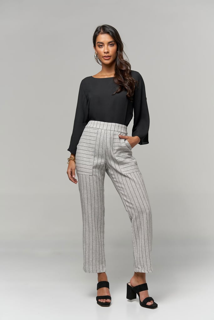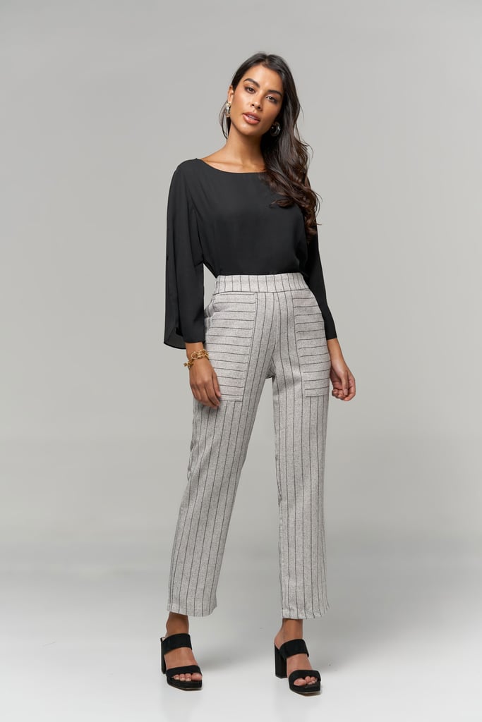 Calça reta de tweed leve, cintura alta com elástico no cós e bolsos frontais