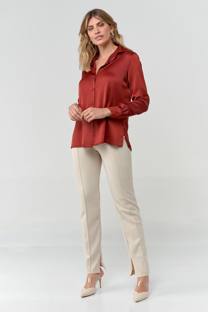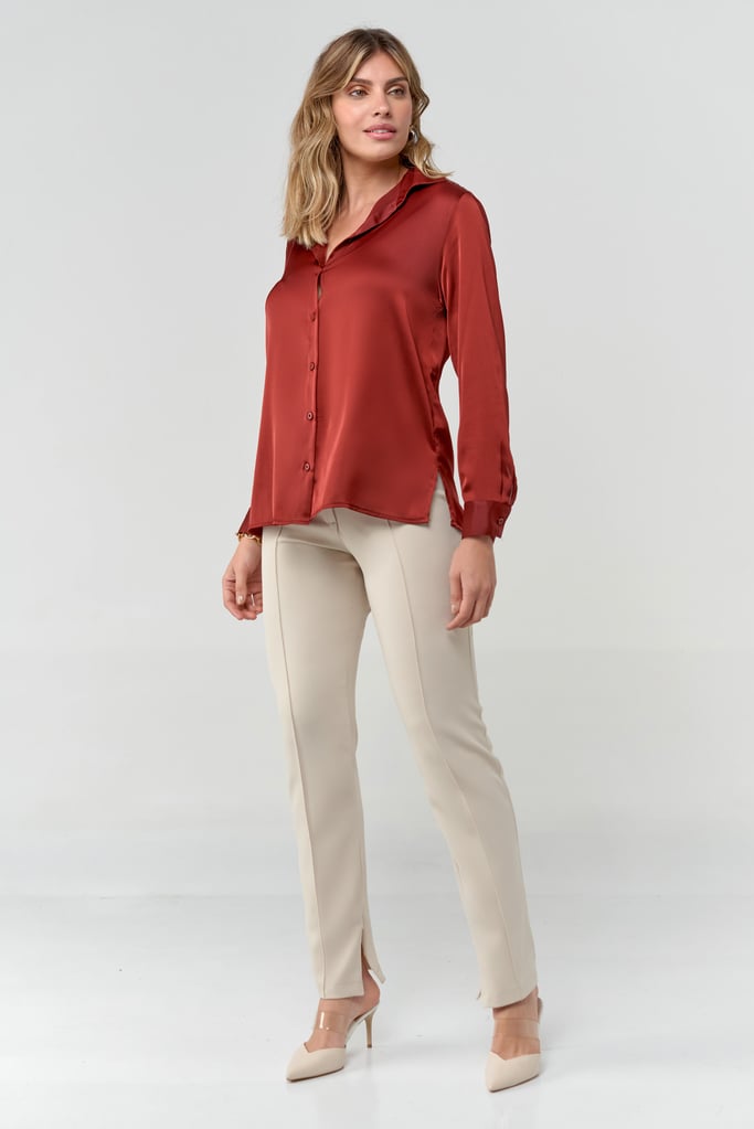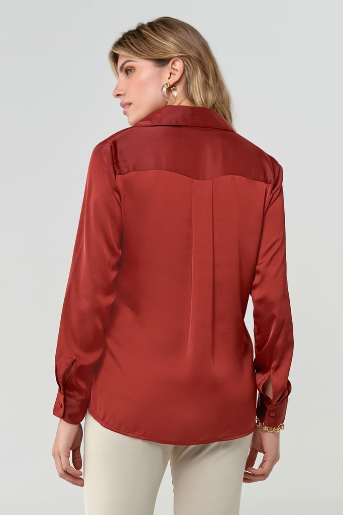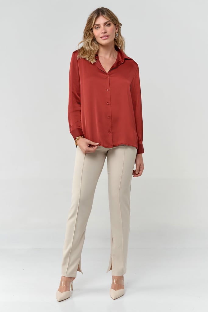 Camisa de satin, comprimento regular, gola de camisa, manga comprida e fechamento de botão frontal e no punho