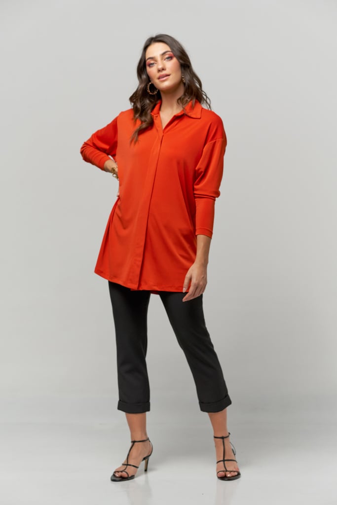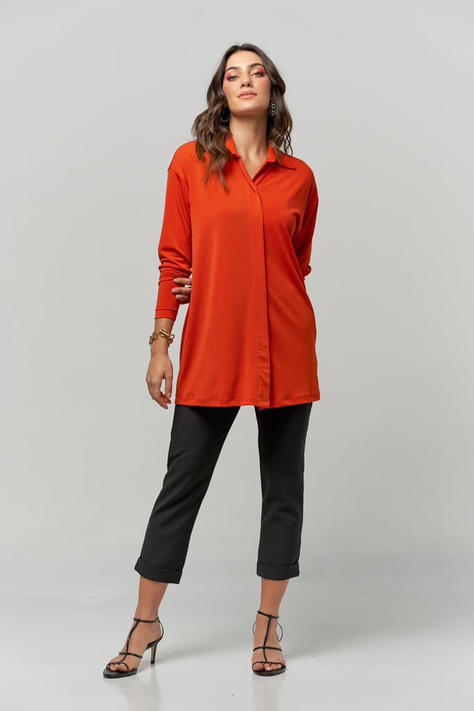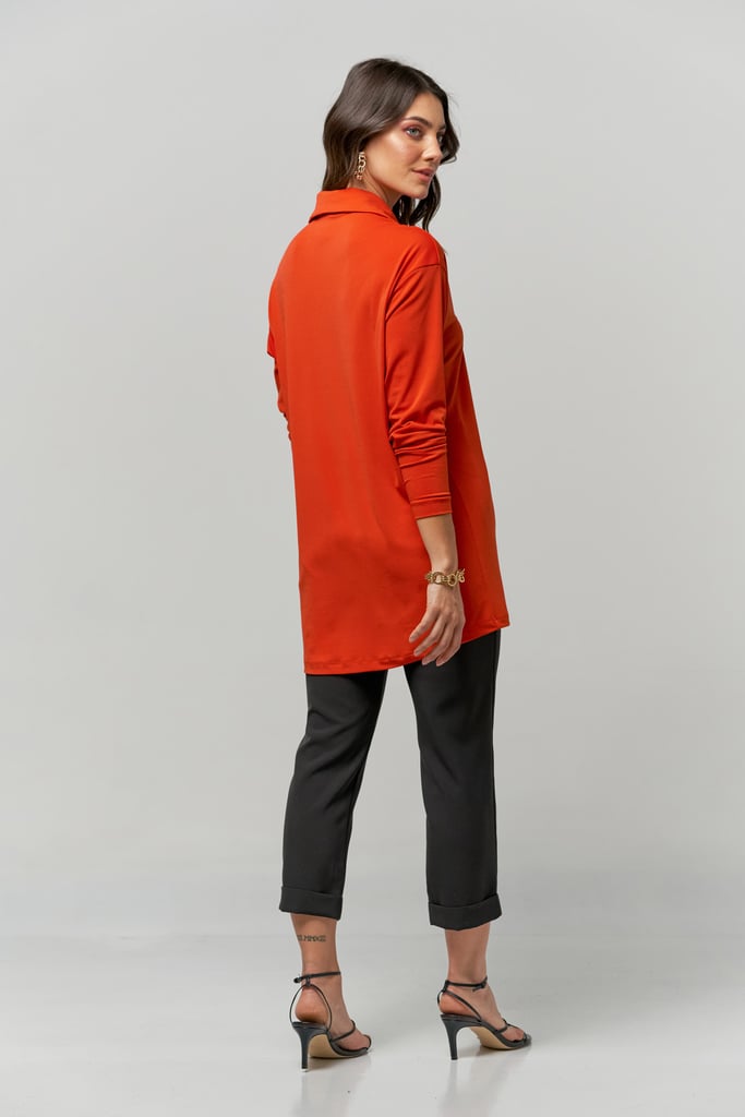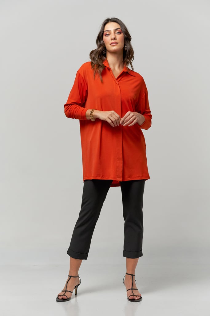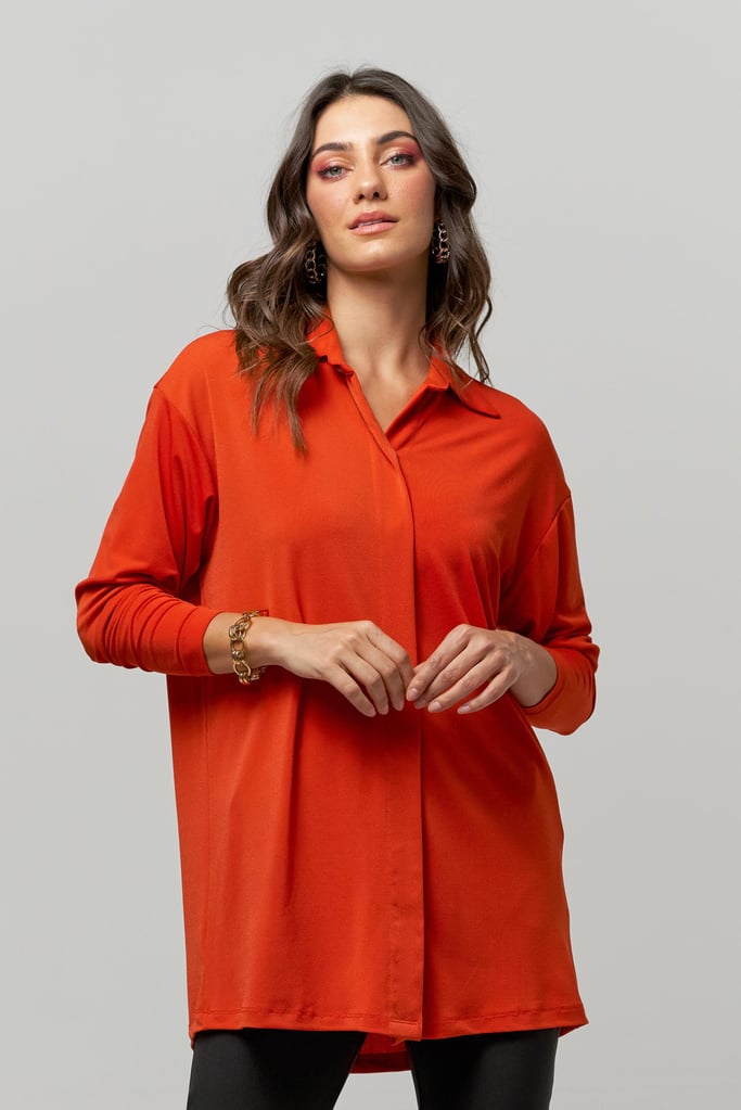 Camisa oversized em tecido de malha creponada, gola, vista com botões não aparentes e manga longa