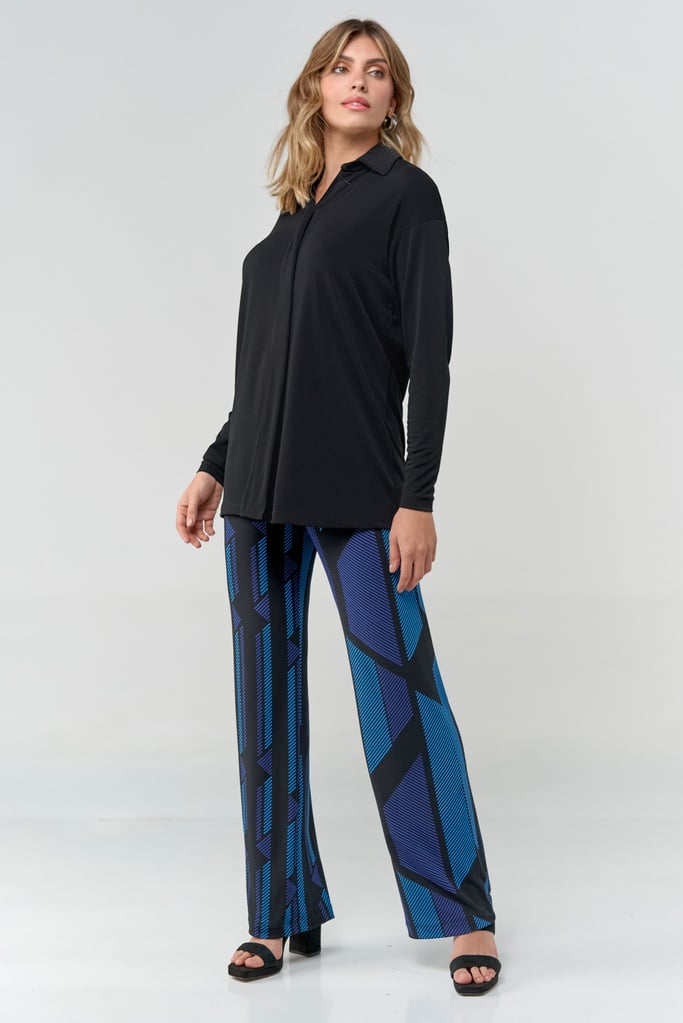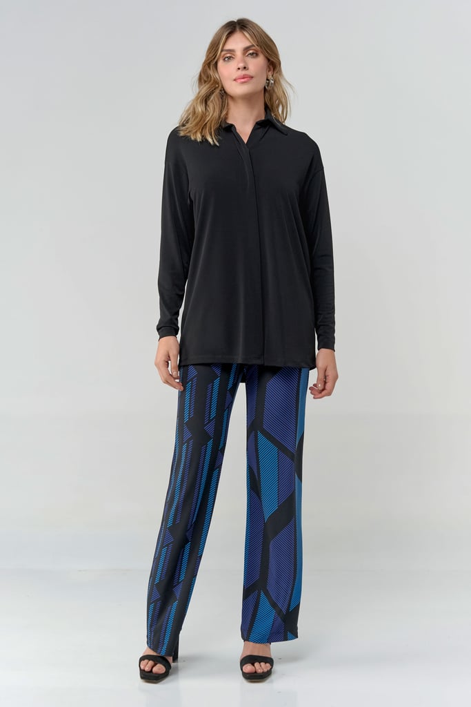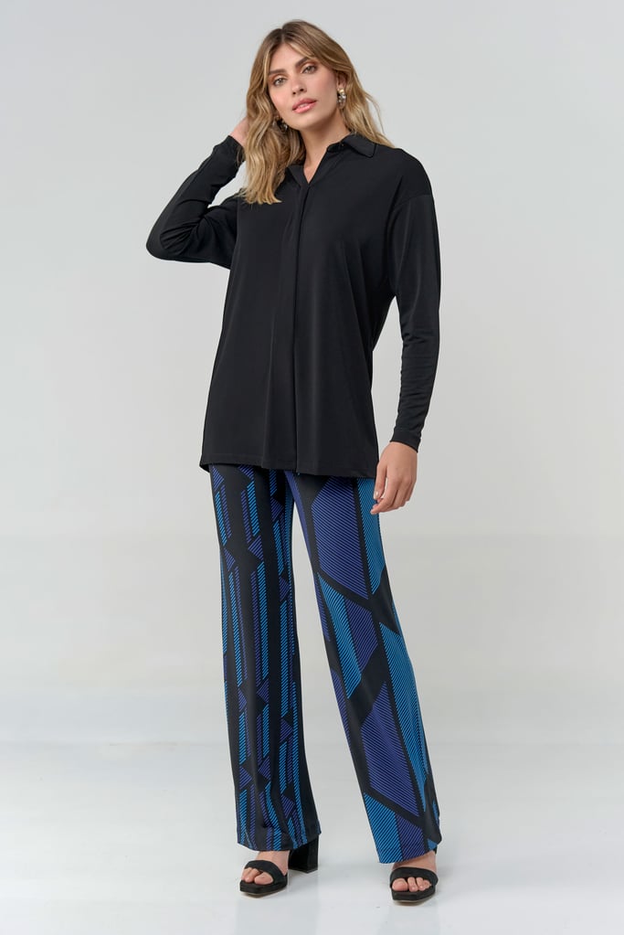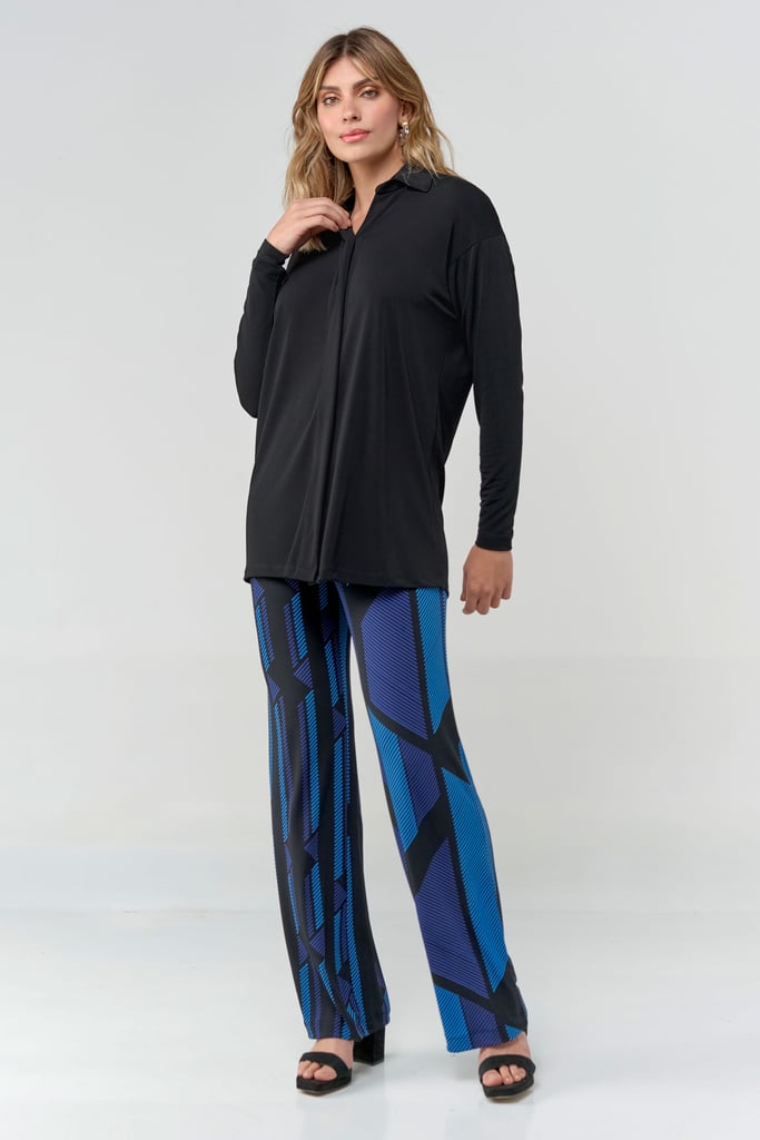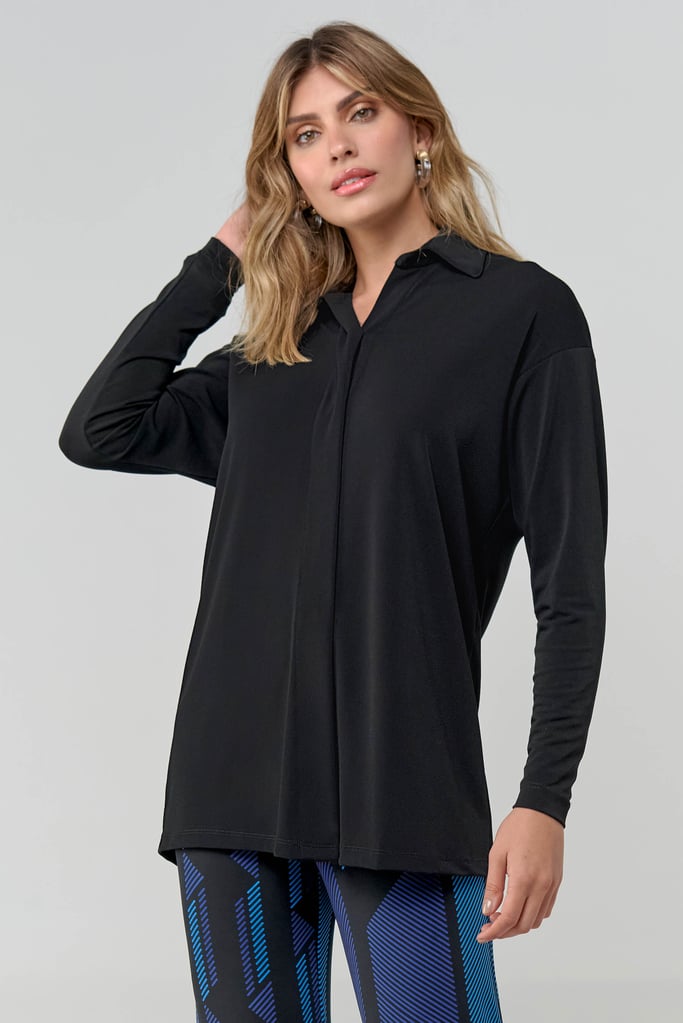Camisa oversized em tecido de malha creponada, gola, vista com botões não aparentes e manga longa