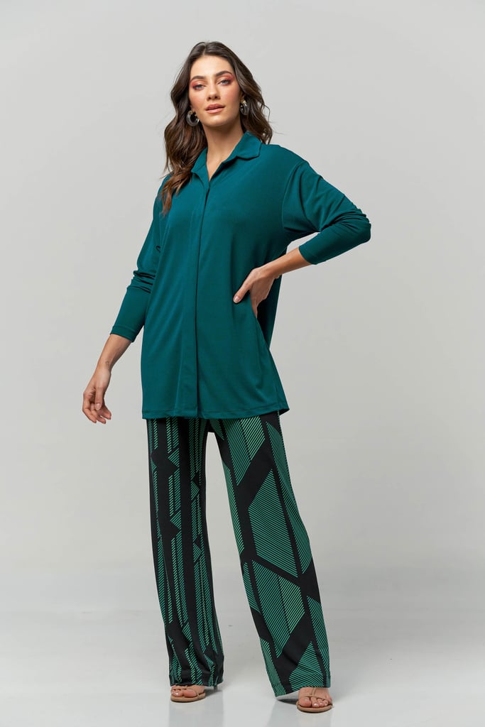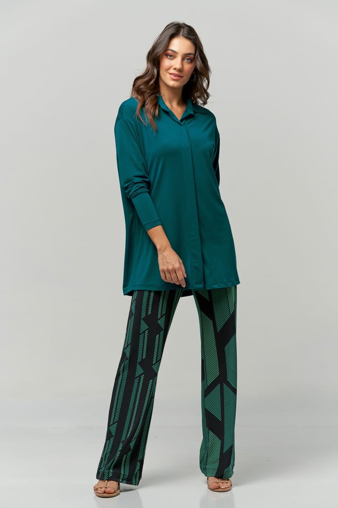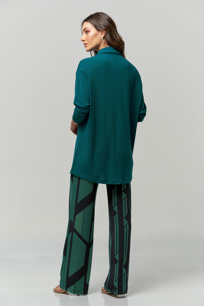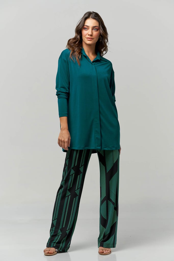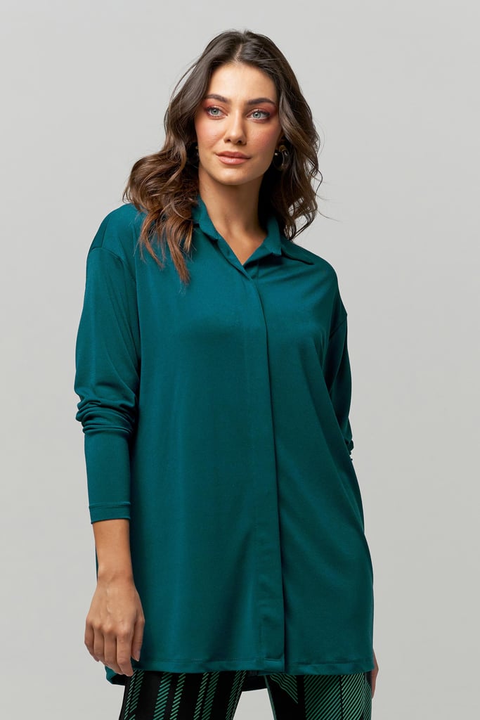 Camisa oversized em tecido de malha creponada, gola, vista com botões não aparentes e manga longa