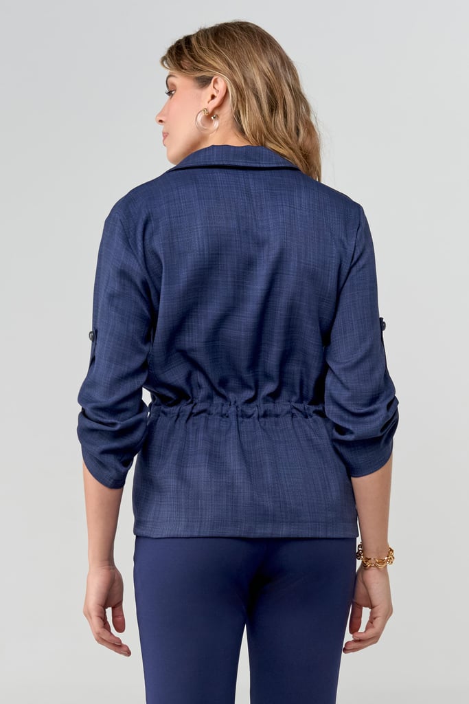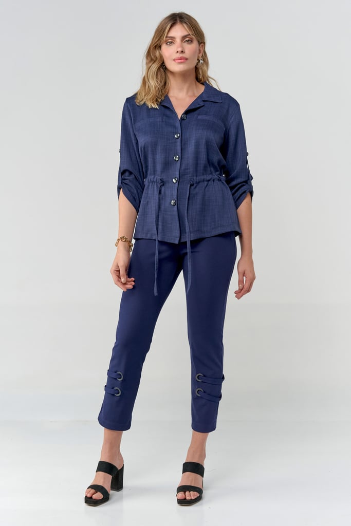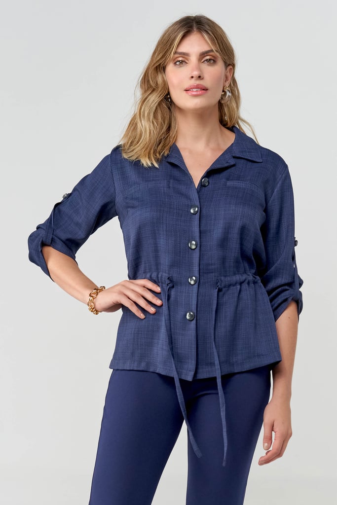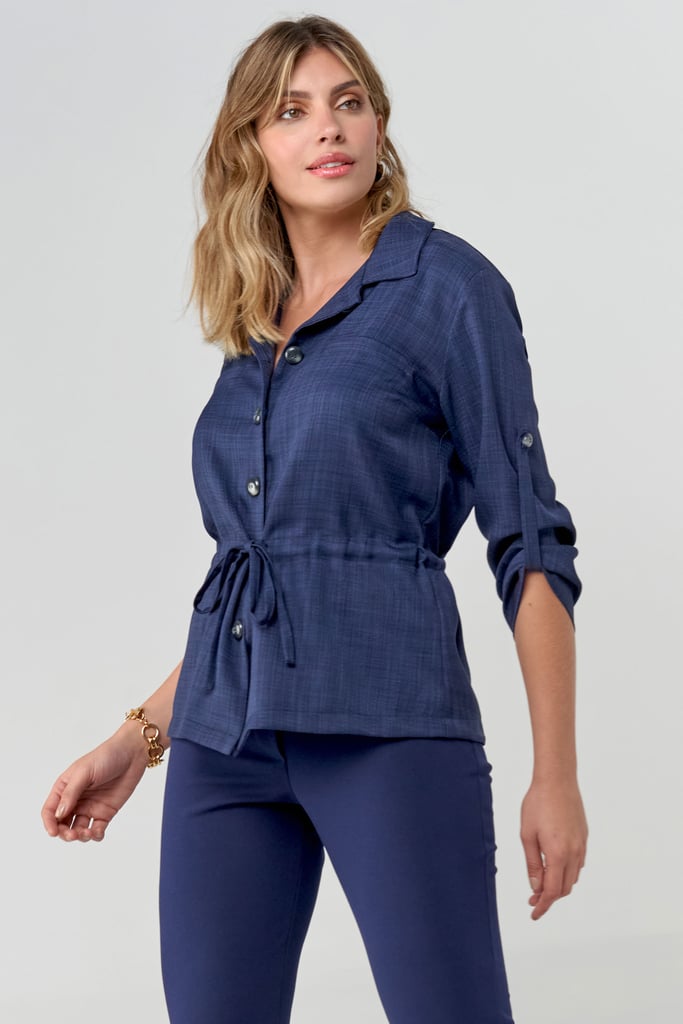Trench de poliéster, gola de camisa, fechamento por botões, bolsos frontais falsos, puxador na cintura para ajuste, manga longa e martingale