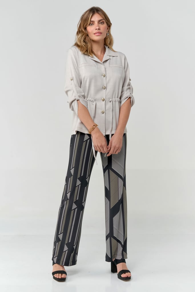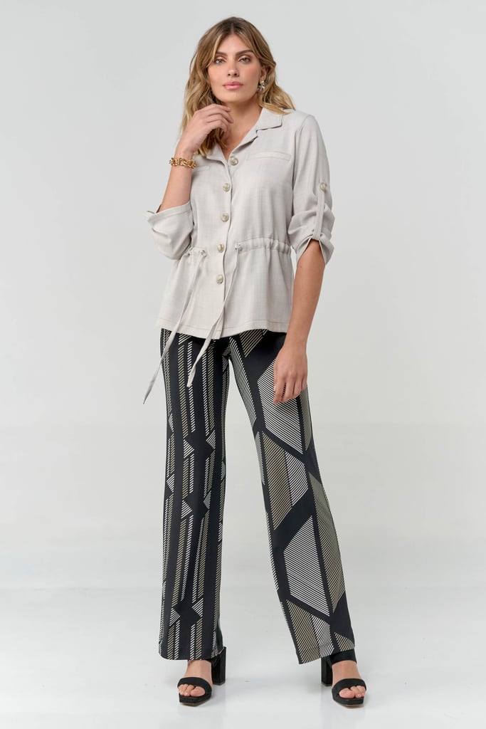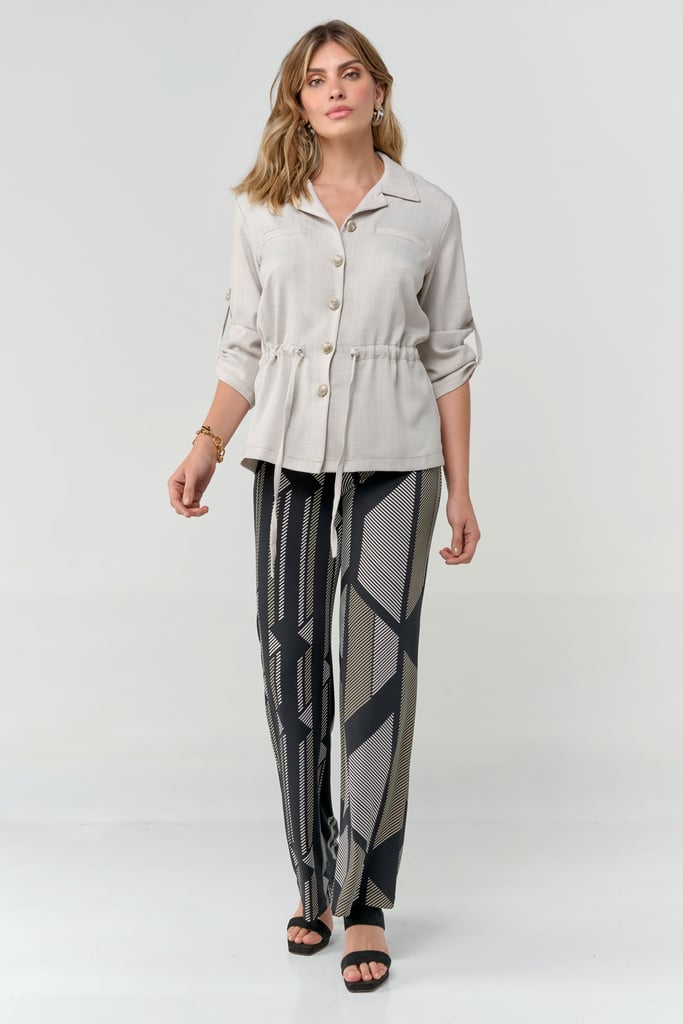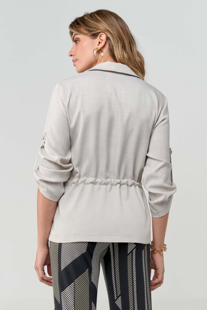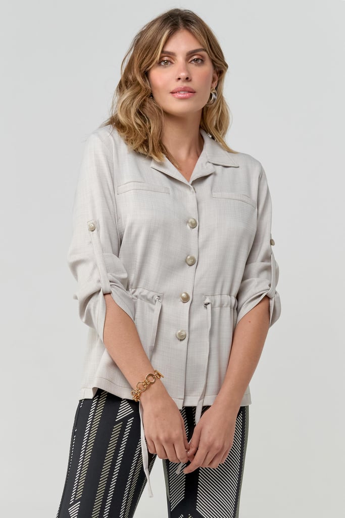 Trench de poliéster, gola de camisa, fechamento por botões, bolsos frontais falsos, puxador na cintura para ajuste, manga longa e martingale