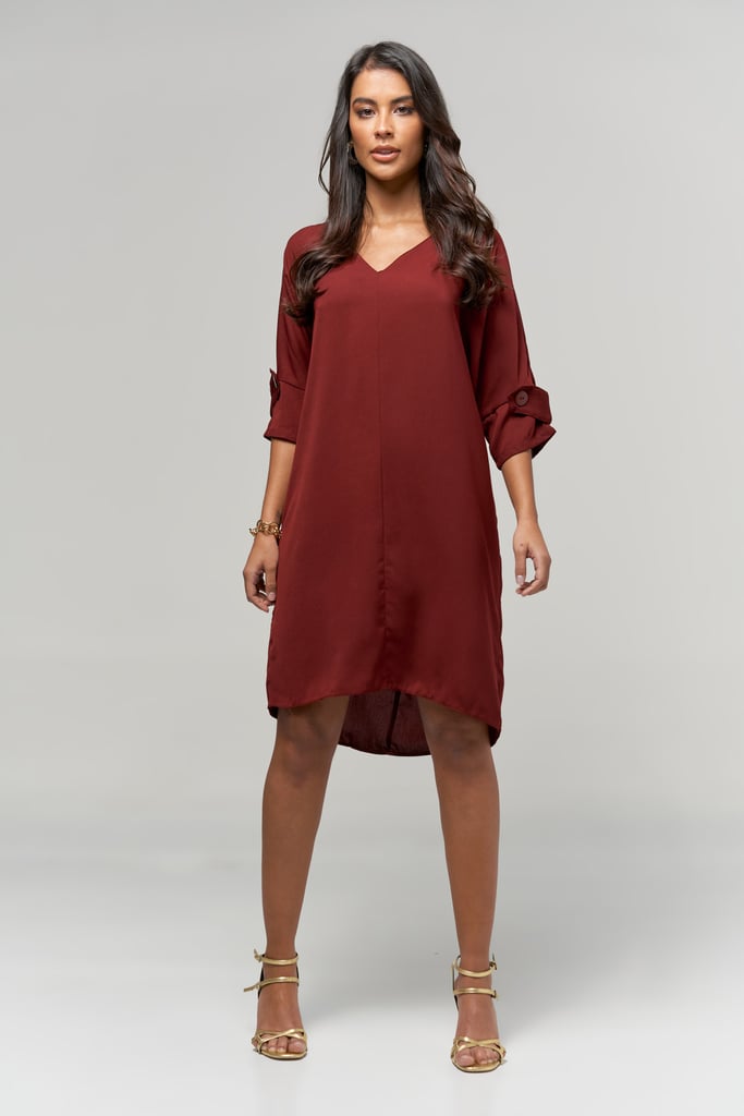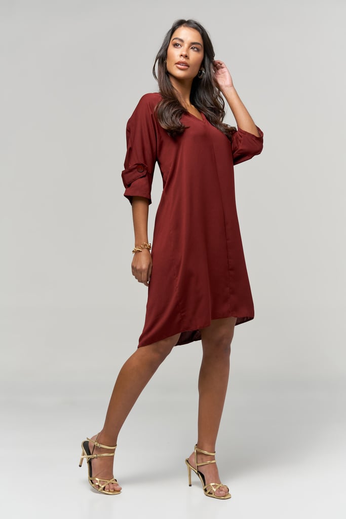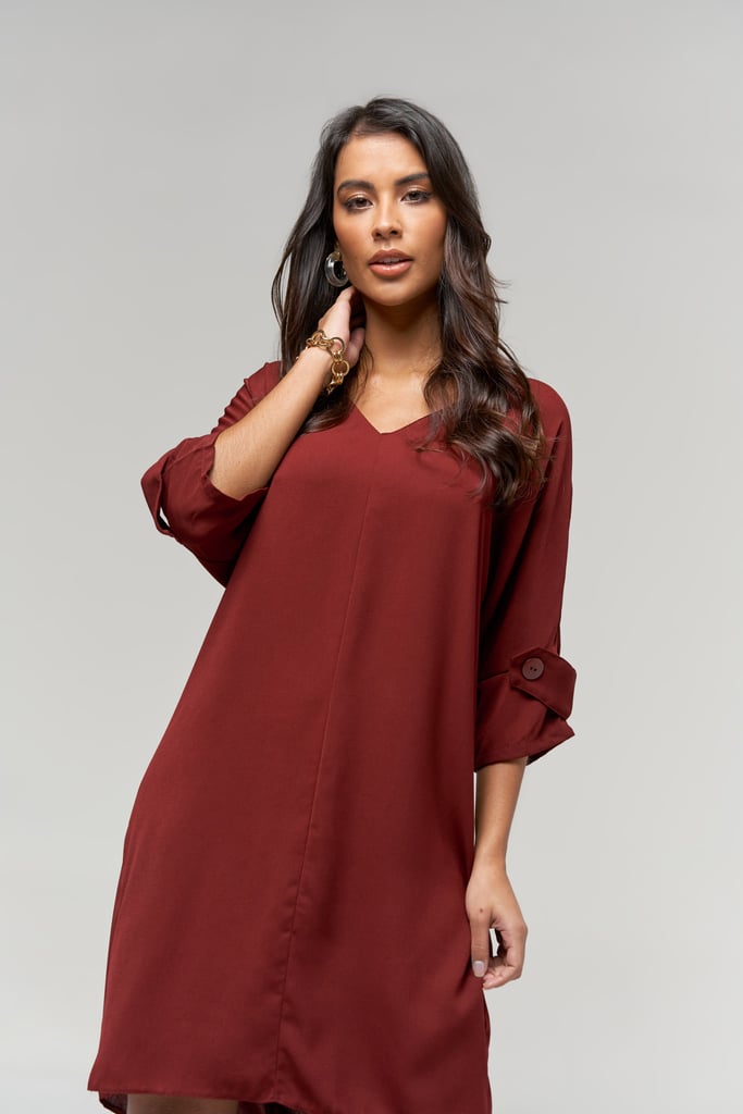 Vestido Liso Decote V com Botão na Manga