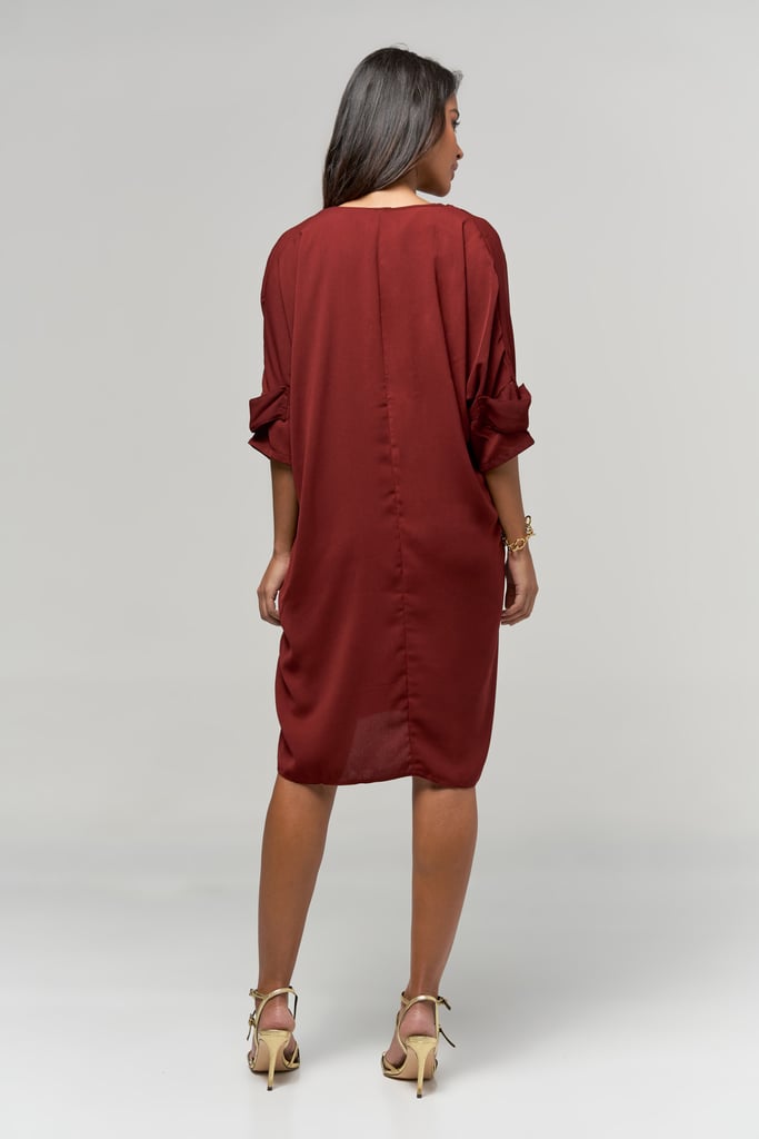 Vestido de crepe, modelagem solta ao corpo, decote V, manga curta com botão e comprimento curto.