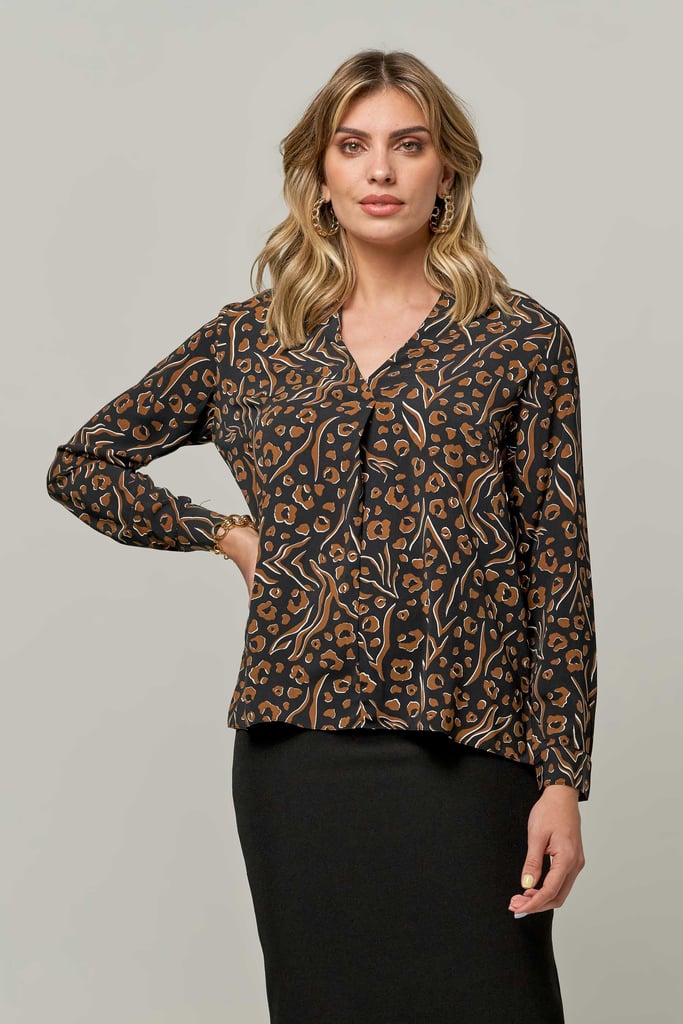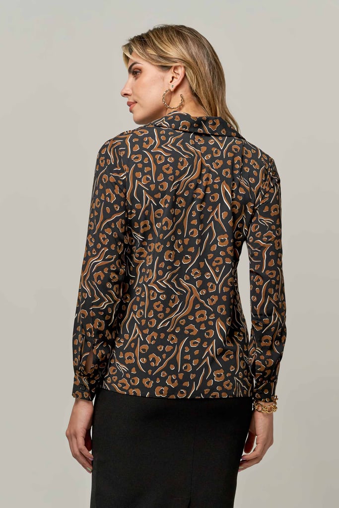 Camisa de crepe estampada, gola, decote V e manga comprida com abotoamento no punho