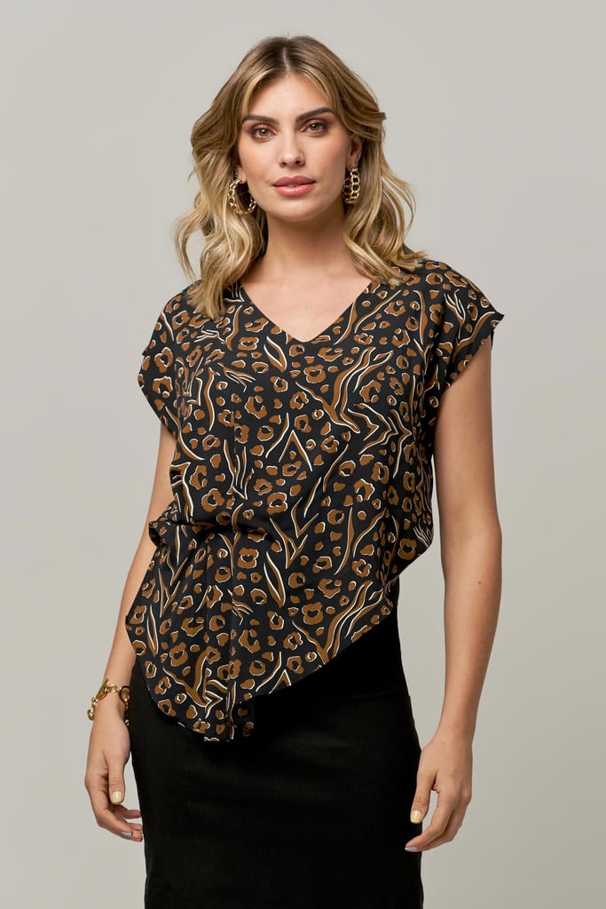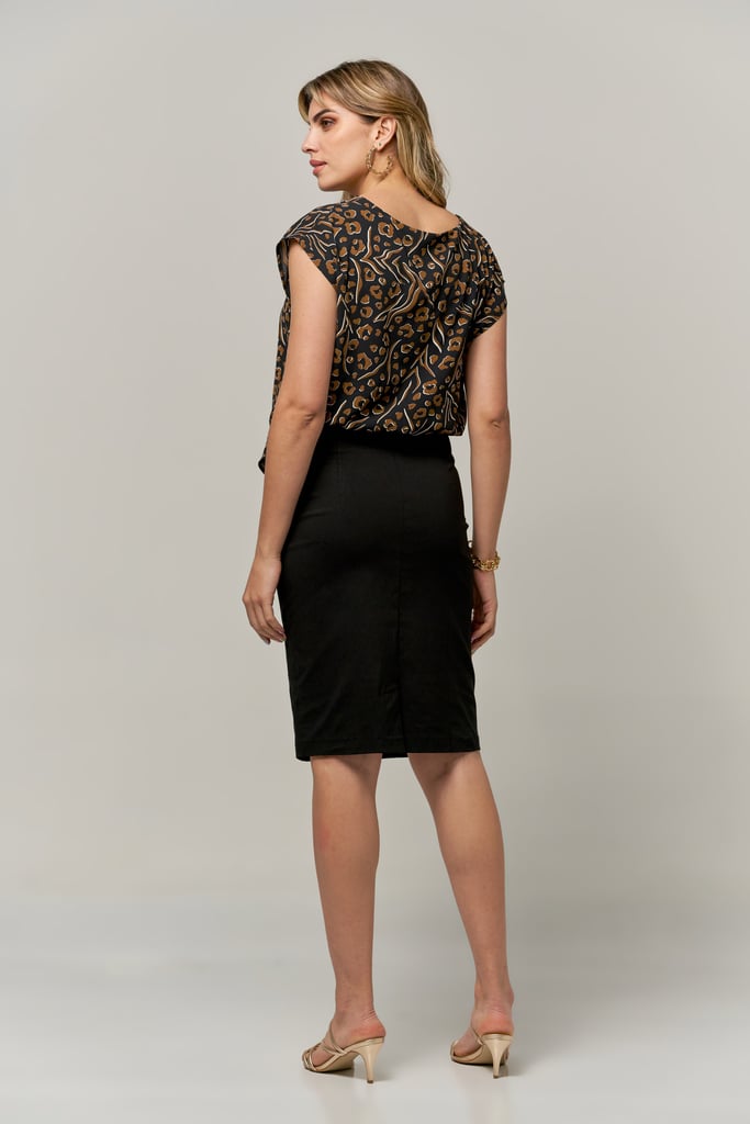 Vestido 2 em 1. Blusa de crepe estampada, manga curta e decote V. Saia lápis de bengaline.