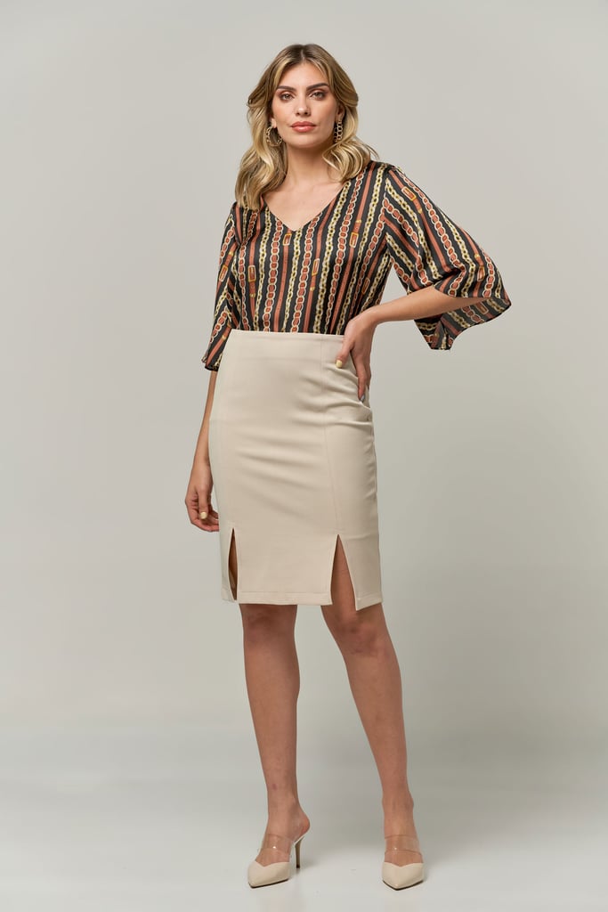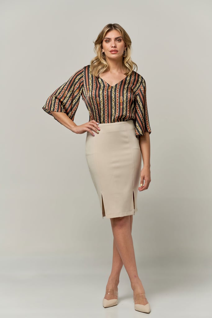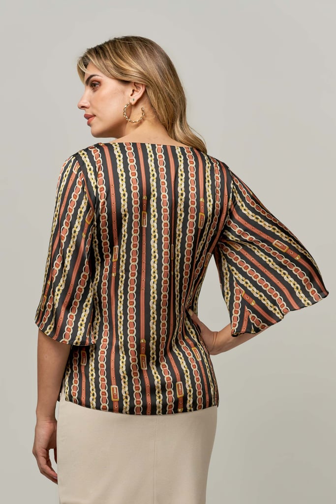 Blusa de satin toque de seda, padronagem de correntes, decote V e manga 3/4 tipo sino