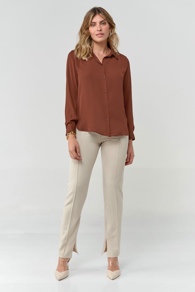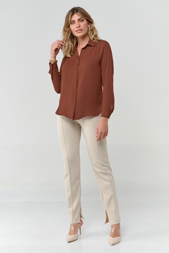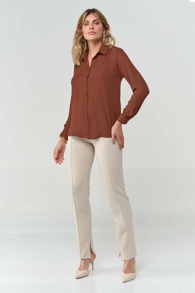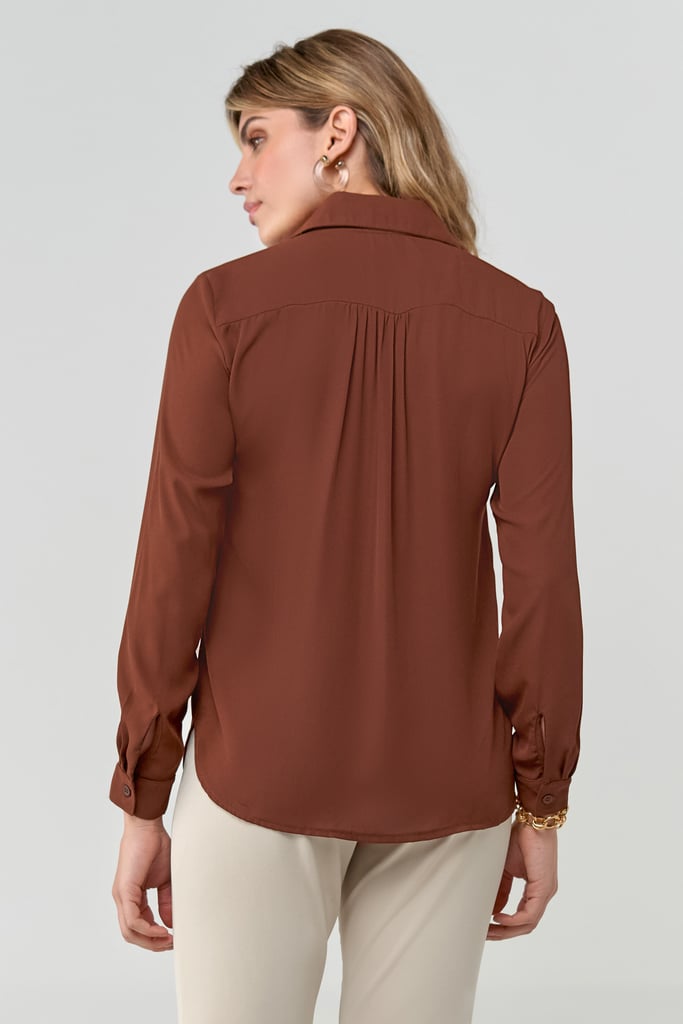 Camisa de crepe, gola, pé de gola, vista com botões, manga com punho fechado por botão e detalhe de franzido no ombro