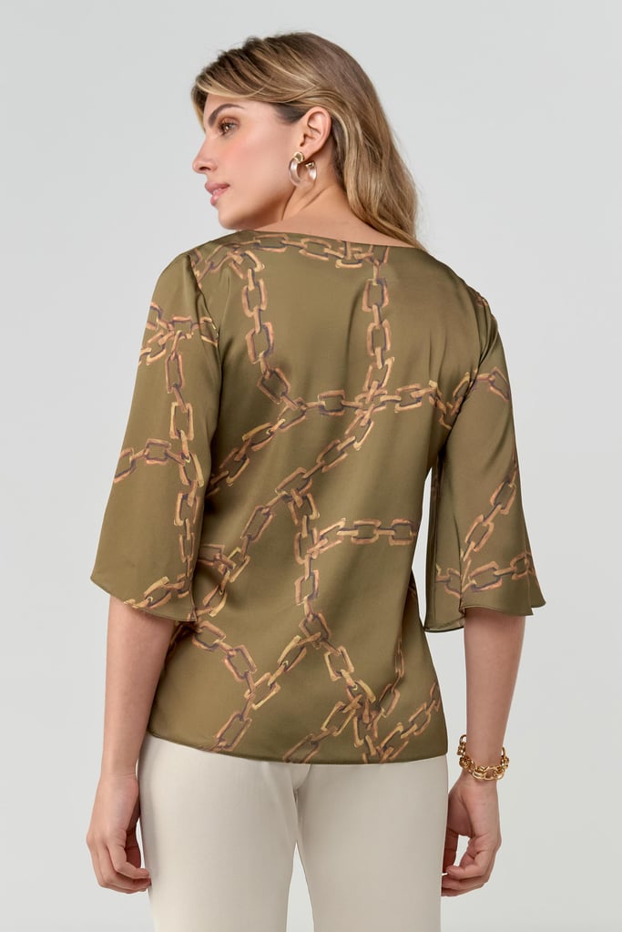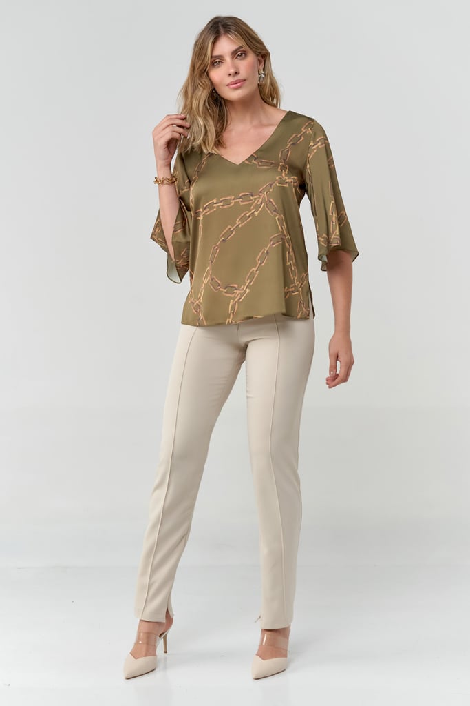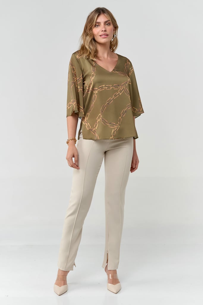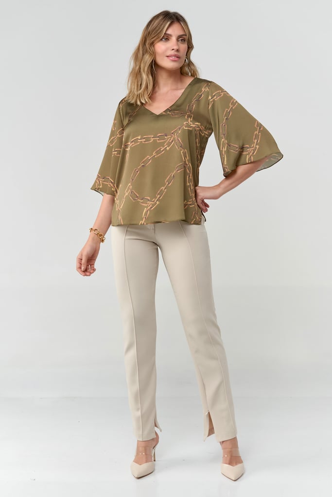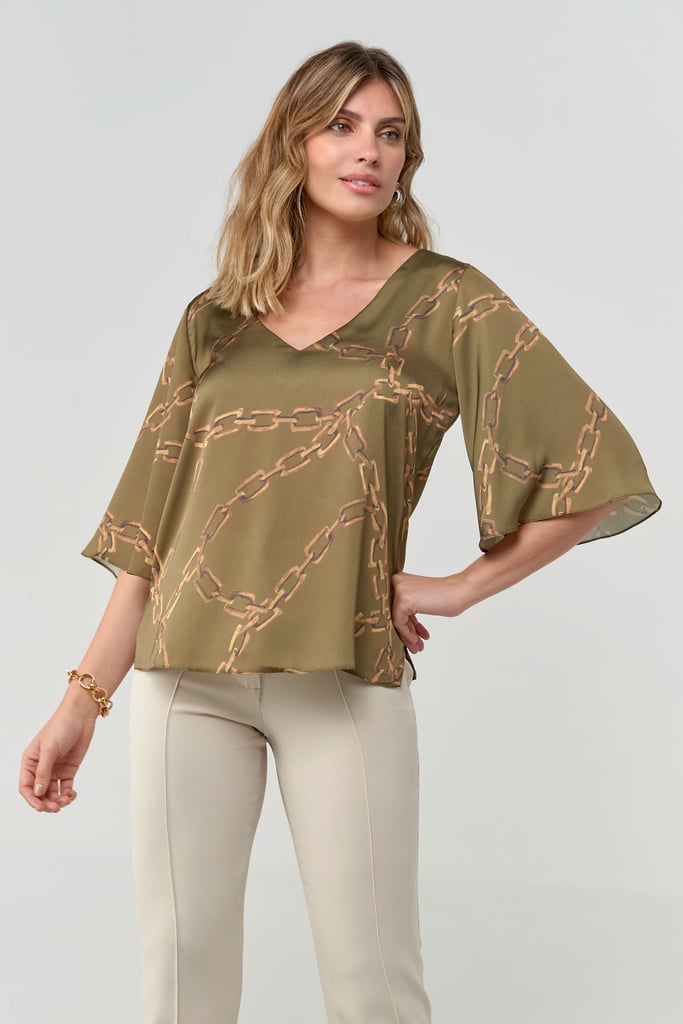 Blusa de satin estampada, decote V e manga 3/4 tipo sino.